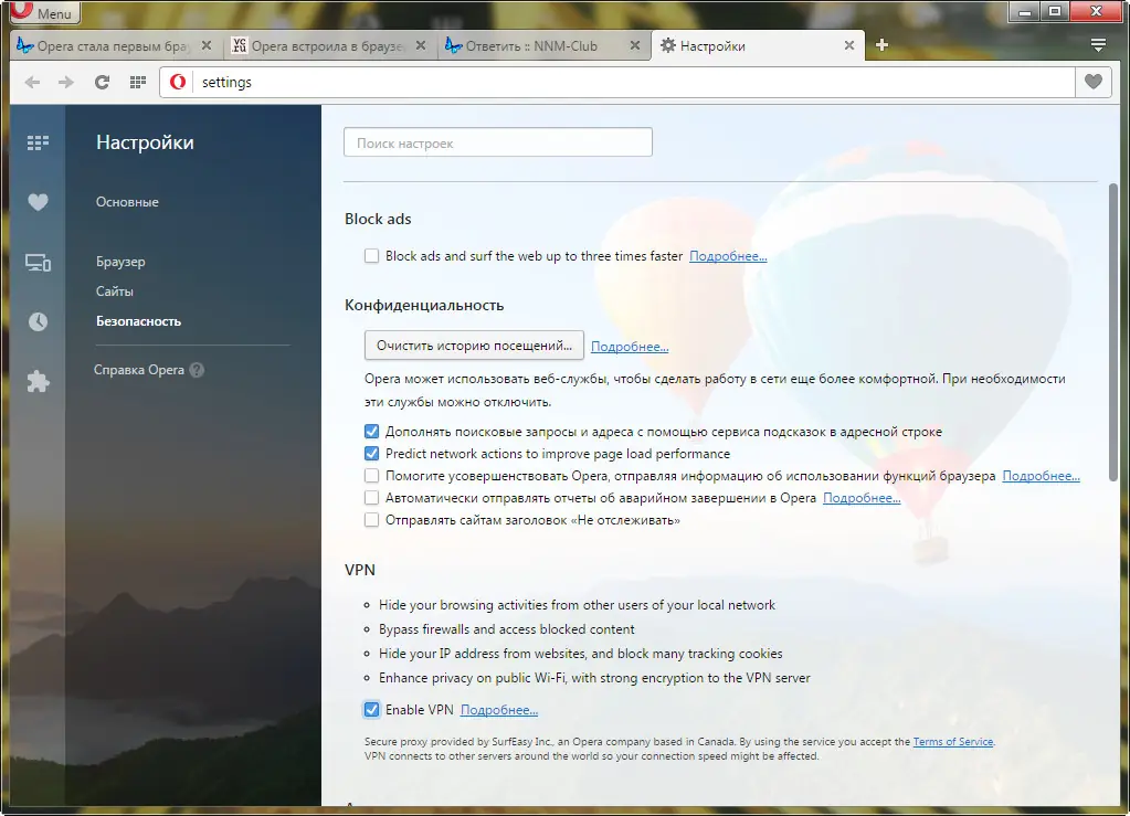 - Встроен бесплатный и безлимитный VPN-сервис, который позволяет защитить трафик и скрыть IP-адрес без необходимости устанавливать дополнительные приложения.
