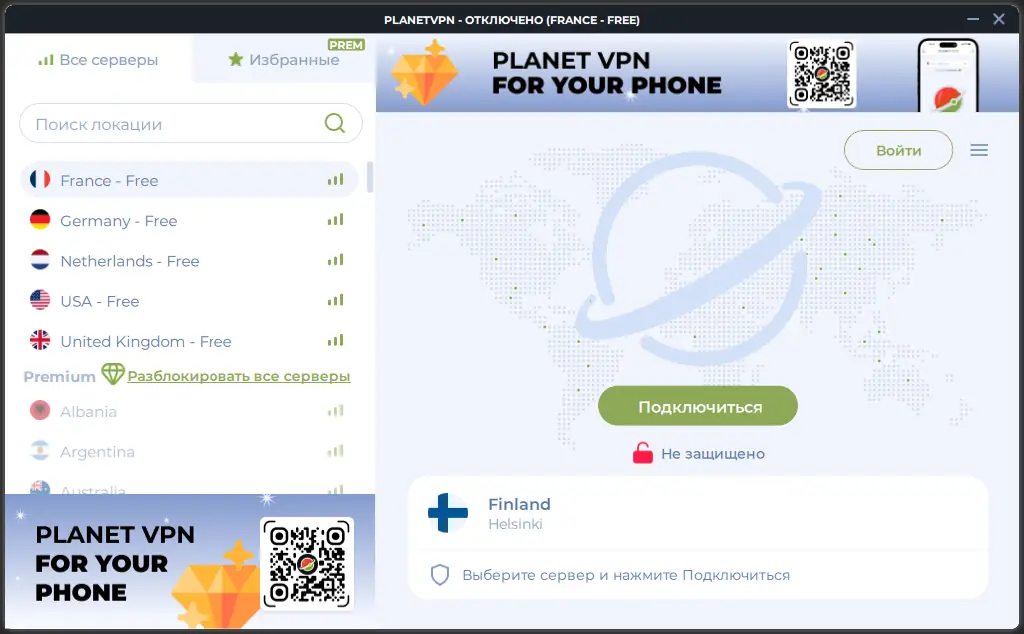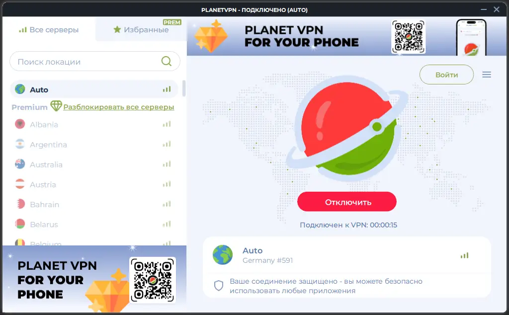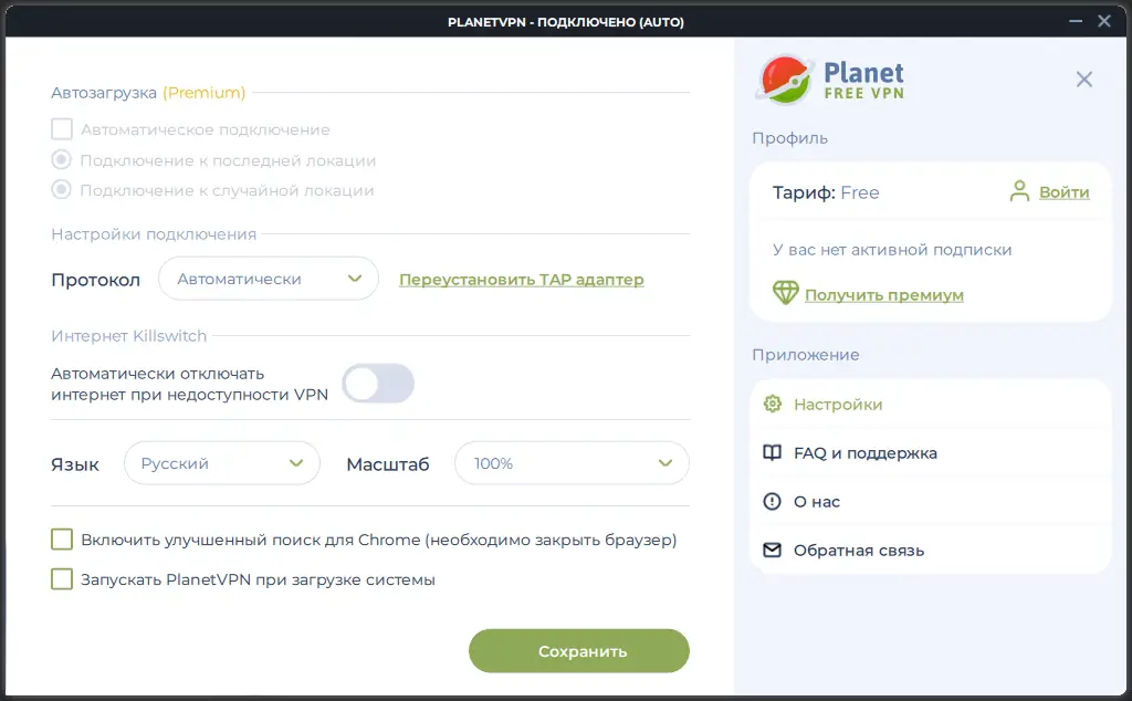 PlanetVPN — это полностью бесплатный сервис виртуальной частной сети, обеспечивающий высокую скорость соединения и полную анонимность в интернете. Программа не требует регистрации, не собирает личные данные пользователей и предоставляет неограниченный трафик без снижения скорости.