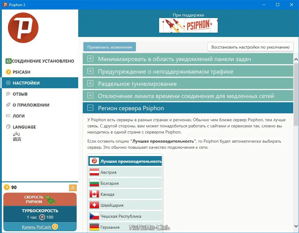 Psiphon — это инструмент для обхода интернет-ограничений, сочетающий технологии впн, SSH и HTTP-прокси. Программа помогает получать доступ к ресурсам, заблокированным на уровне провайдера или государства, автоматически подключаясь к доступным серверам.
