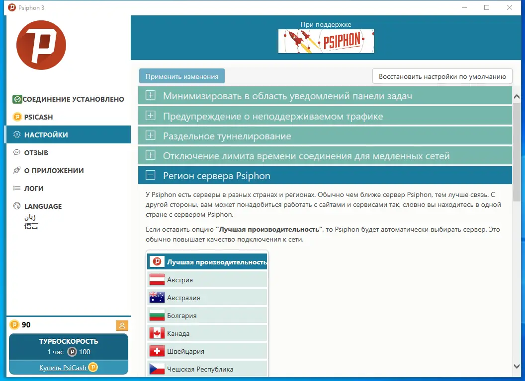 Программу можно получить бесплатно на официальном сайте разработчика. Доступны версии для установки и portable-решение, которое не требует инсталляции. Чтобы начать использовать Psiphon, достаточно скачать архив, распаковать его и запустить исполняемый файл. После завершения сессии достаточно закрыть приложение — соединение прервётся, и IP-адрес вернётся к исходному.
