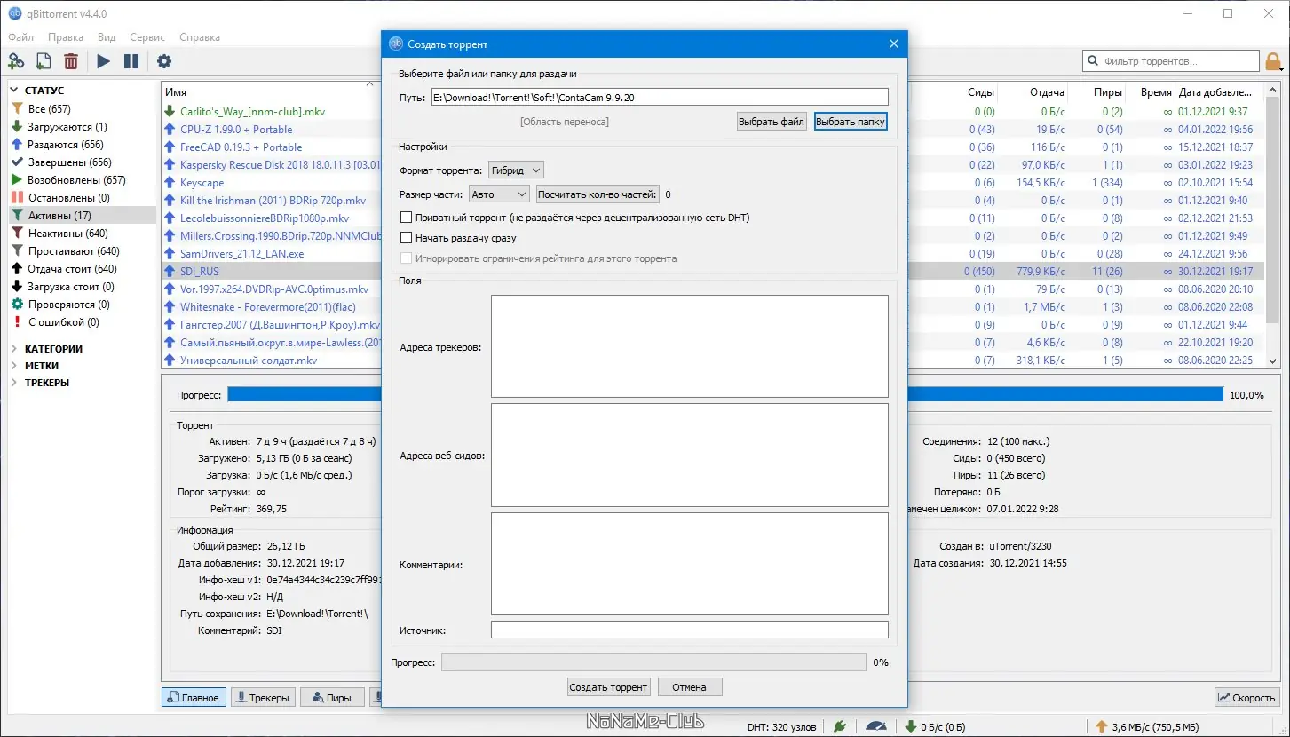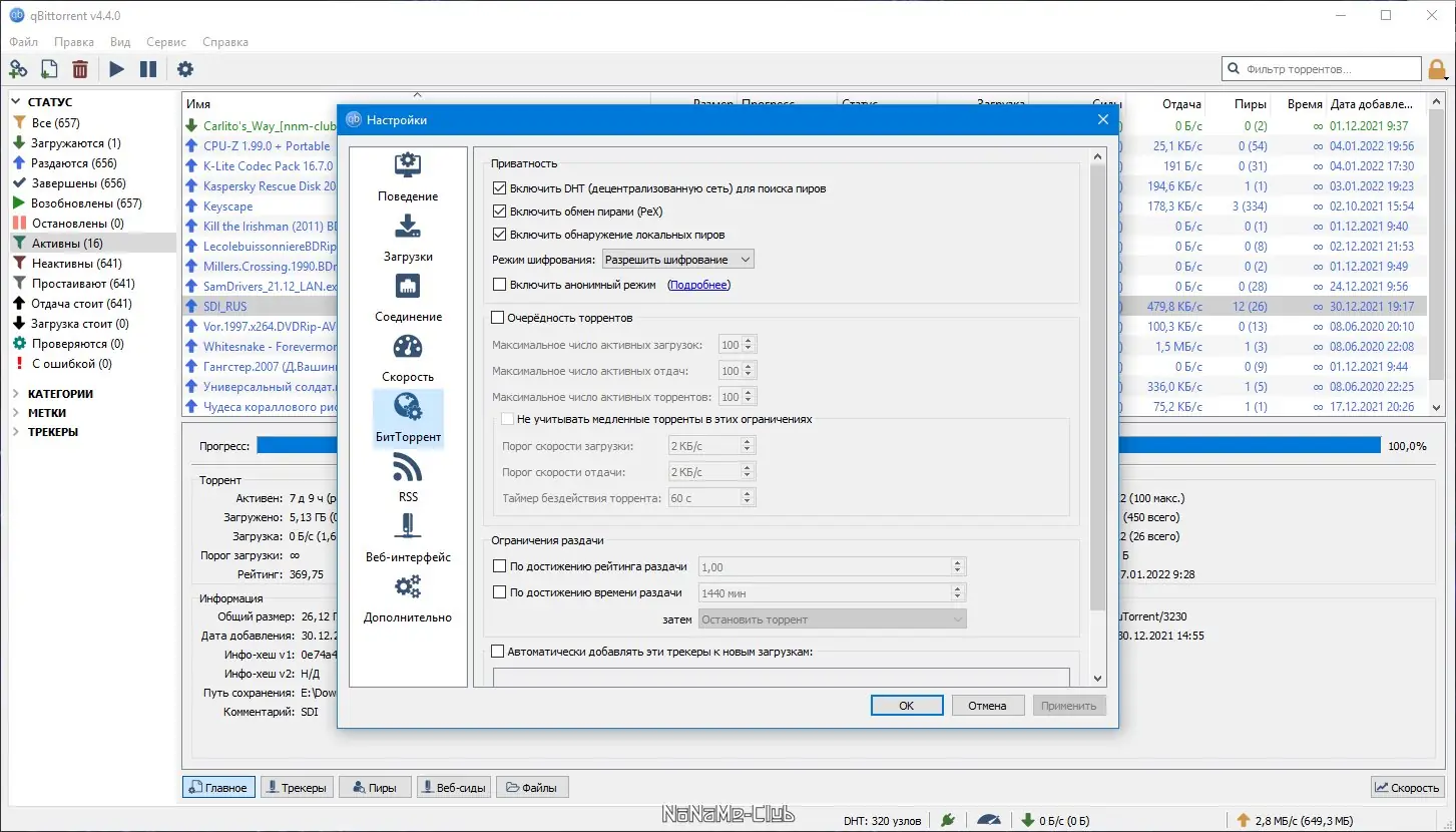 - Гибкие настройки приоритетов файлов и ограничения скорости загрузки и раздачи.
