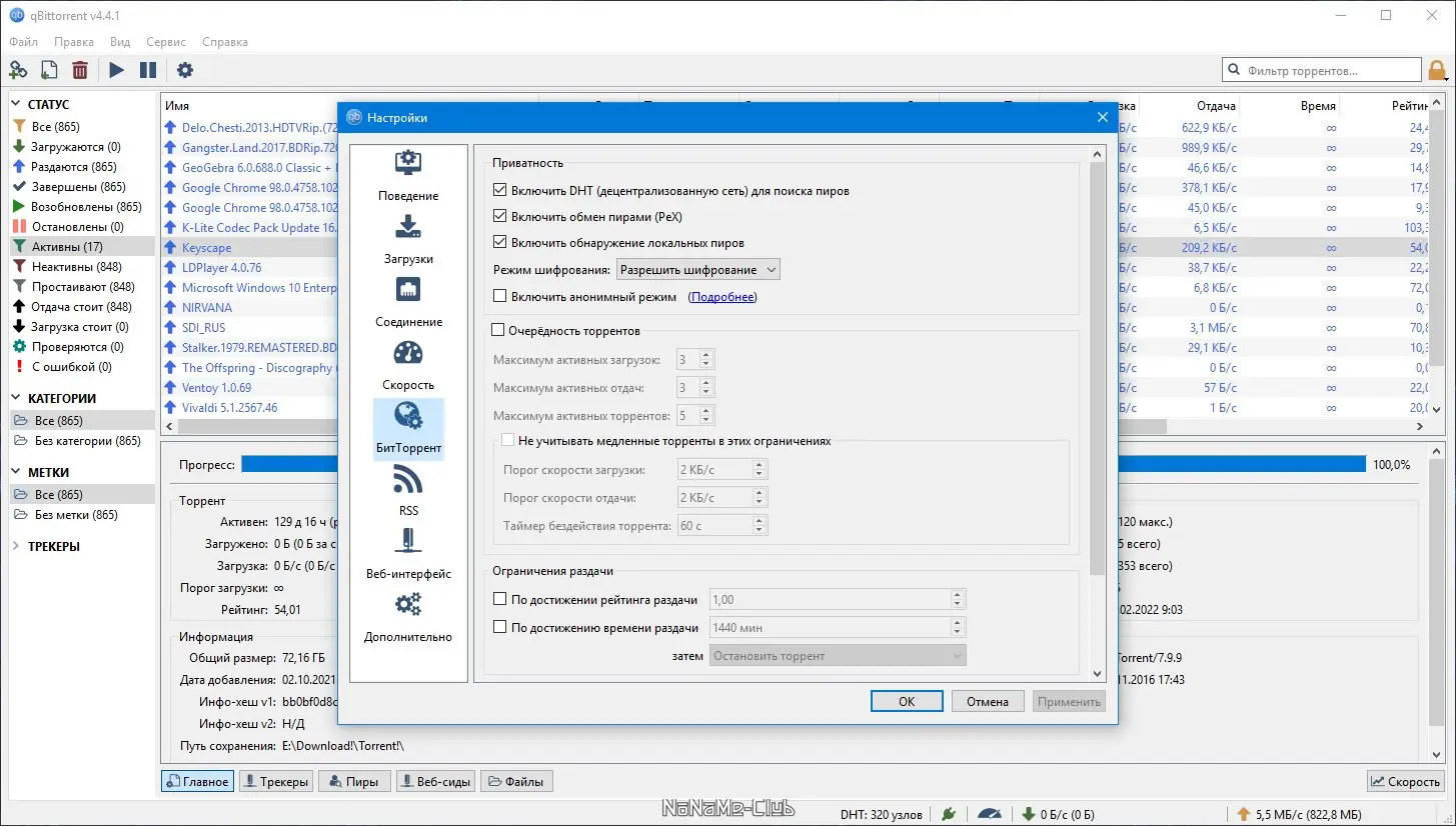 - Гибкие настройки приоритетов файлов и ограничения скорости загрузки и отдачи