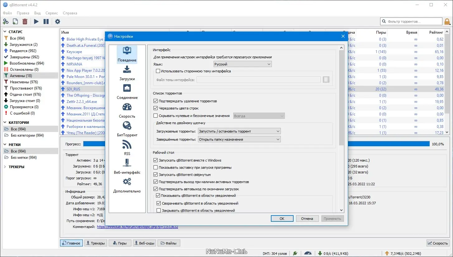 - Поддержка меток и категорий для удобной сортировки активных торрентов.