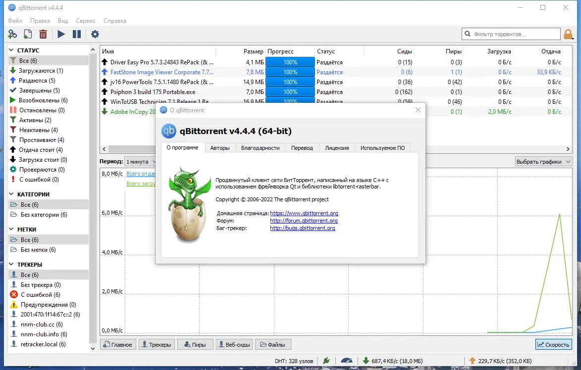 qBittorrent — это легковесный и функциональный клиент для загрузки торрент-файлов, разработанный с акцентом на производительность, простоту и отсутствие рекламы. Программа предлагает широкий набор инструментов, включая встроенный поисковик, поддержку удалённого управления, фильтрацию IP-адресов и настройку скорости, что делает её одним из лучших решений в категории торрент-клиентов. Поддержка множества протоколов и расширений позволяет эффективно использовать её на различных платформах без необходимости дополнительных настроек.