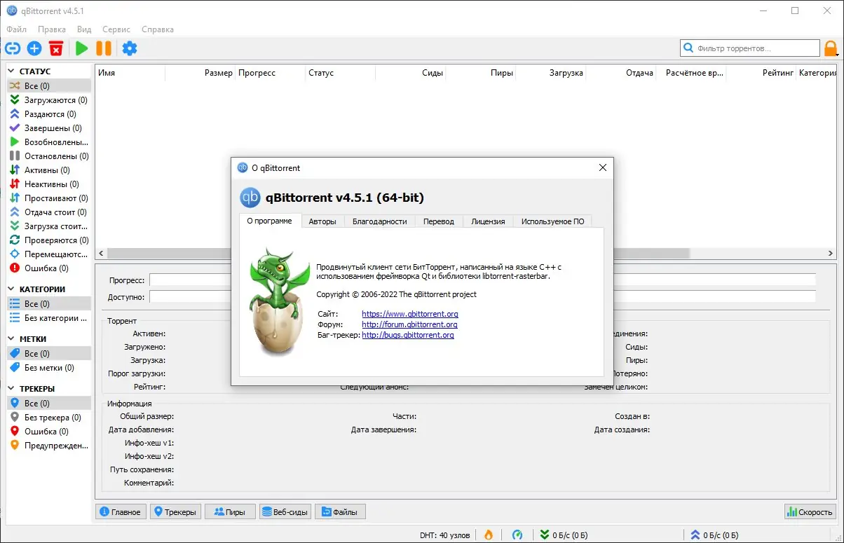 qBittorrent — это современный торрент-клиент с открытым исходным кодом, разработанный на основе библиотеки libtorrent-rasterbar. Приложение создано с использованием языка C++ и графического фреймворка Qt, что обеспечивает высокую производительность и кроссплатформенность. В отличие от многих аналогов, оно не содержит рекламы, шпионских модулей или навязчивых предложений. Программа активно развивается, регулярно получает обновления и поддерживается сообществом. Она поддерживает широкий спектр сетевых технологий и предоставляет продвинутые инструменты для управления трафиком и файлами.
