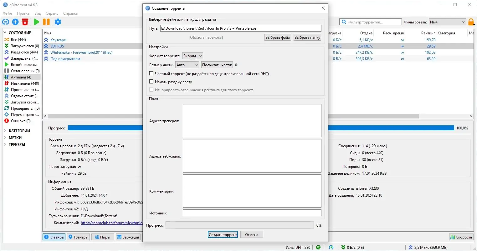 - Поддержка множества технологий, включая DHT, PeX, LPD, Web seed, magnet-ссылки и мультитрекерные раздачи.