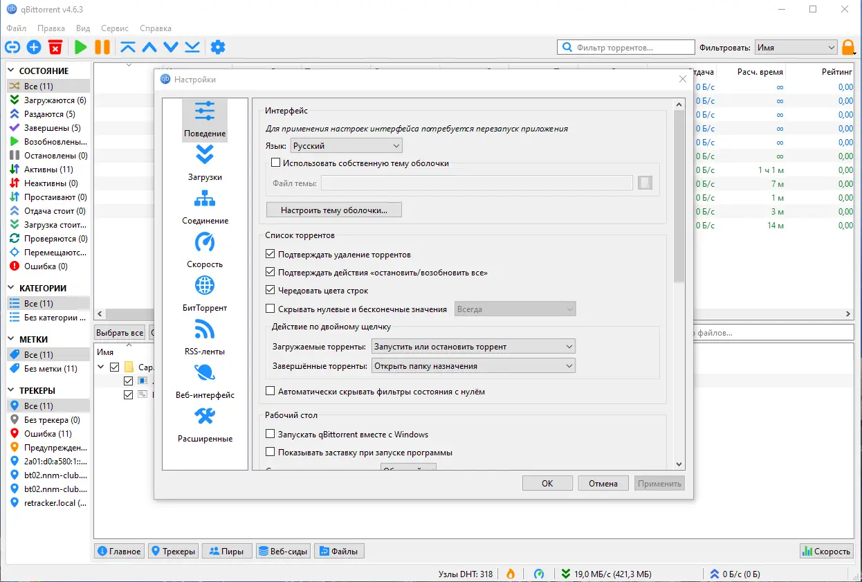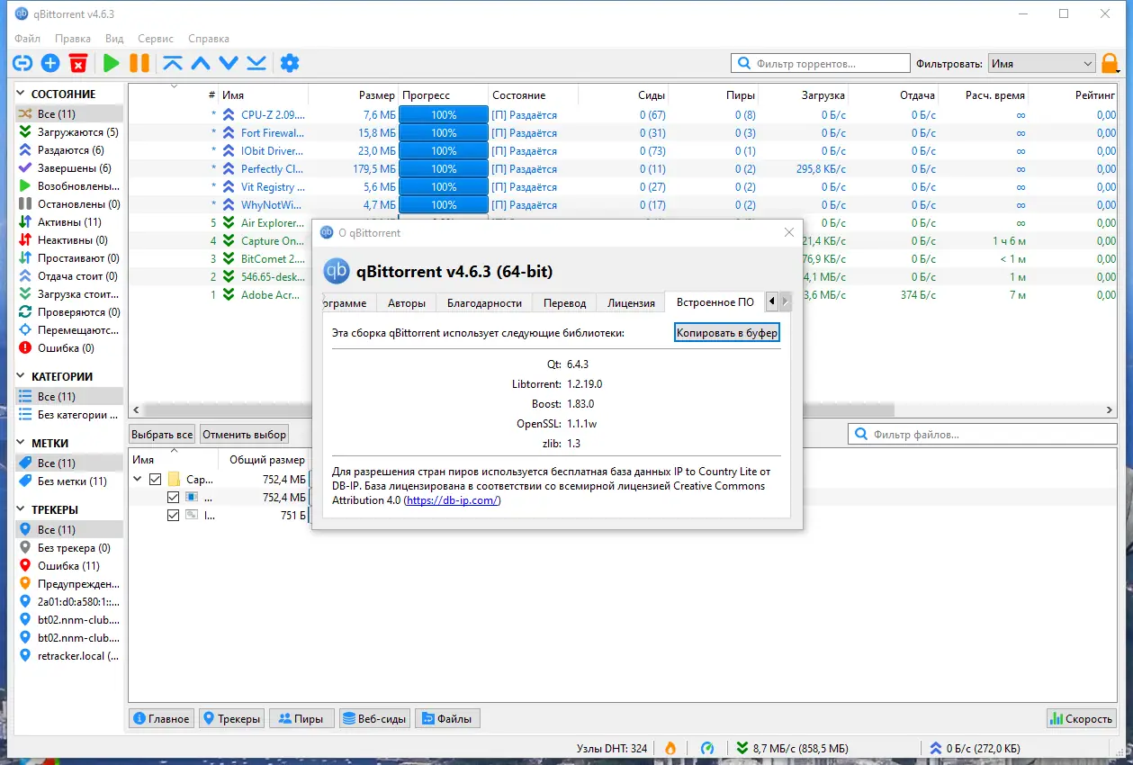 - Поддержка всех распространённых расширений протокола BitTorrent, включая DHT, PeX, LPD и шифрование соединений.