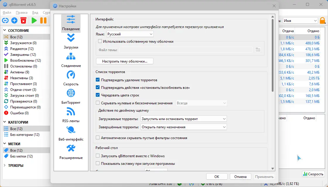 - Программа поддерживает работу с метками, что упрощает сортировку и поиск активных торрент-файлов.