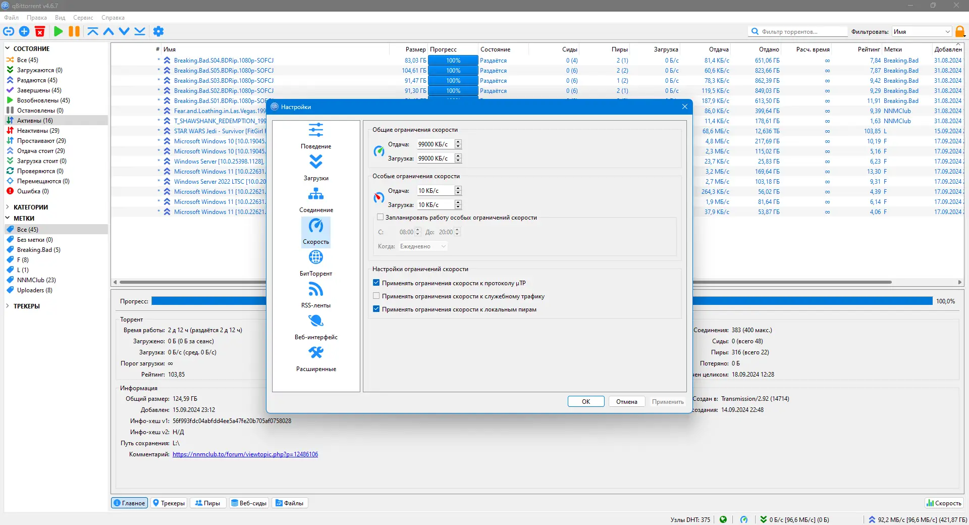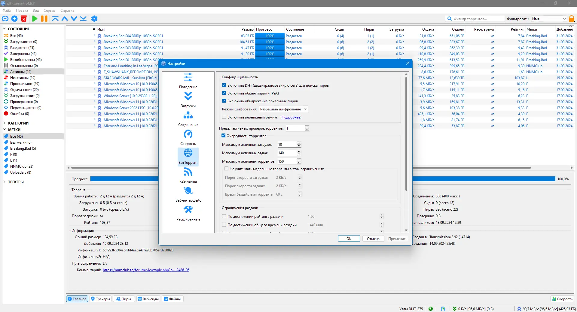 - Поддержка современных сетевых протоколов, включая IPv6 и Web seed, позволяет эффективно участвовать в раздачах и получать доступ к файлам даже при недоступности трекеров.