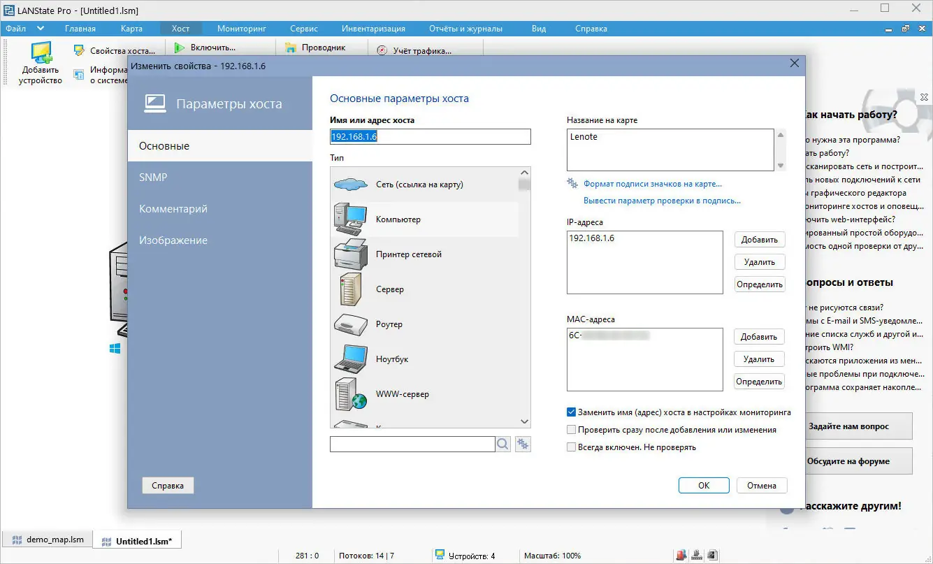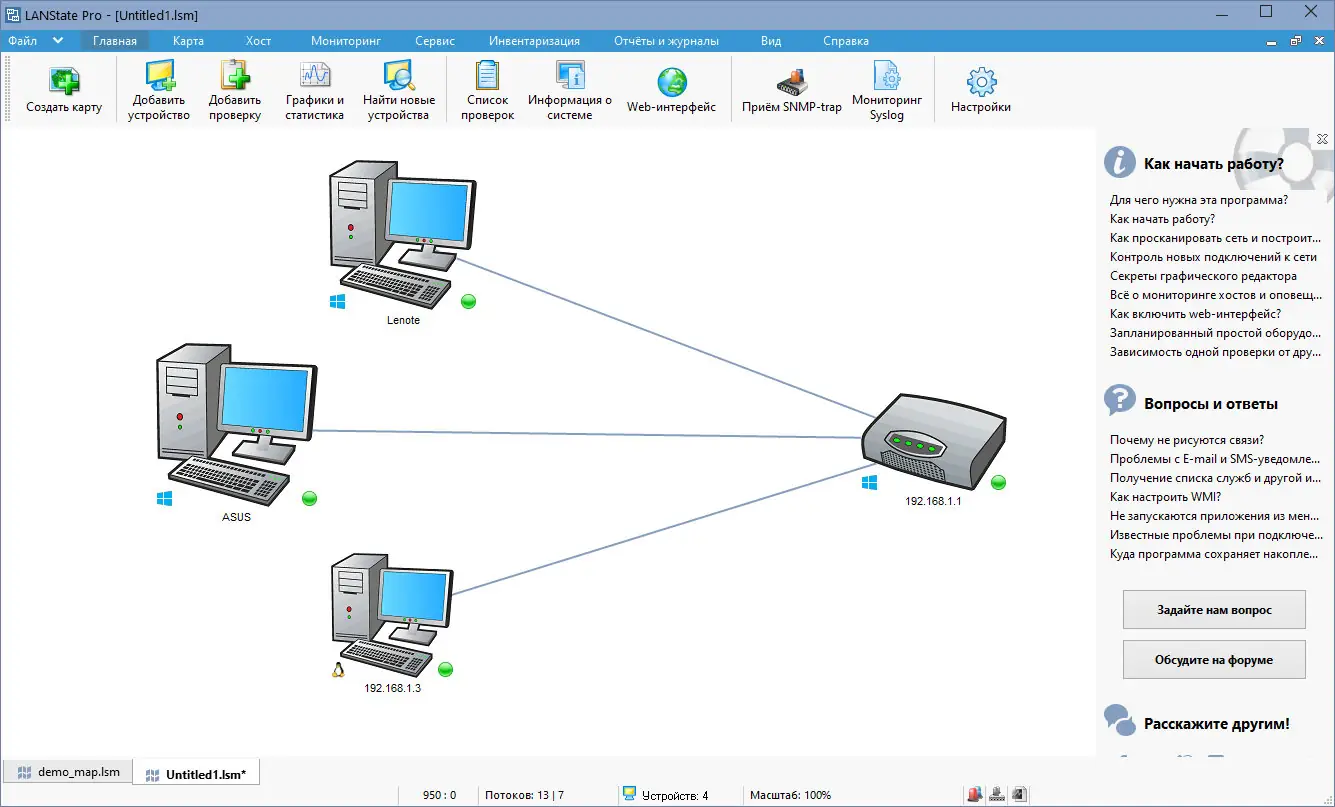 После запуска программа автоматически начинает сканирование сети, определяя доступные хосты и строя графическое представление топологии. Пользователь может вручную добавлять устройства, настраивать зоны мониторинга и задавать параметры проверок. Каждый хост отображается на карте с индикатором состояния, а при необходимости можно вызвать контекстное меню для выполнения административных действий.