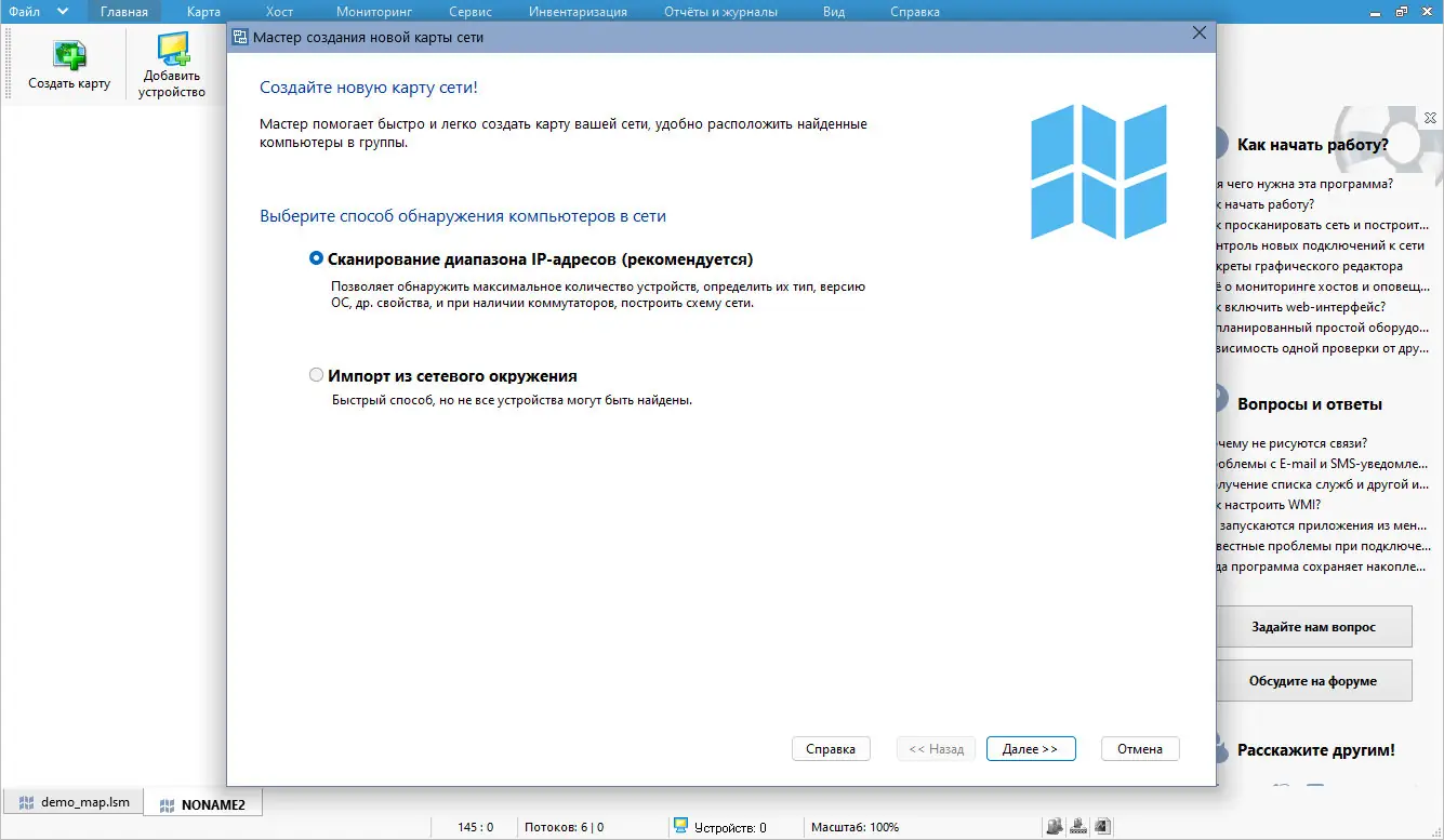 - Автоматическое построение графической схемы сети с возможностью редактирования связей.