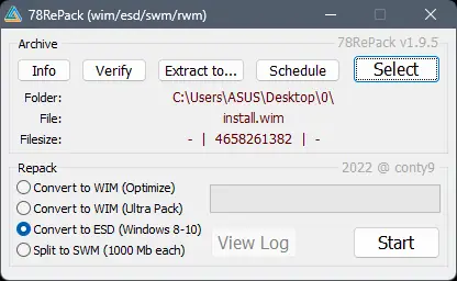 78RePack — это утилита с графическим интерфейсом для конвертации архивов формата Wim, ESD, SWM и RWM, основанная на библиотеках WimLib. Программа позволяет преобразовывать, проверять, распаковывать и оптимизировать образы без зависимости от встроенных инструментов Windows, таких как DISM или Imagex. Поддерживает автоматический выбор файлов, расширенный контроль процесса и работу с различными типами сжатия.