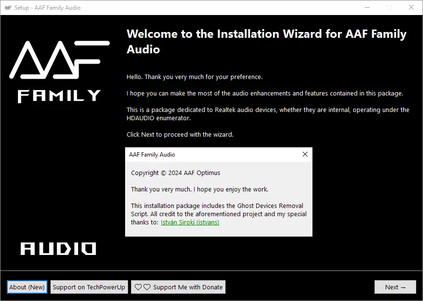 AAF Family DCH Audio Realtek — модифицированный аудиодрайвер для материнских плат с чипами Realtek, объединяющий в себе функционал нескольких звуковых платформ. В состав входят улучшенные версии Realtek Audio Console, Dolby, DTS, Nahimic, Sonic Studio и других технологий для максимального контроля над аудиовыходом. Решение подходит для пользователей, стремящихся к качественному воспроизведению звука в музыке, кино и играх.