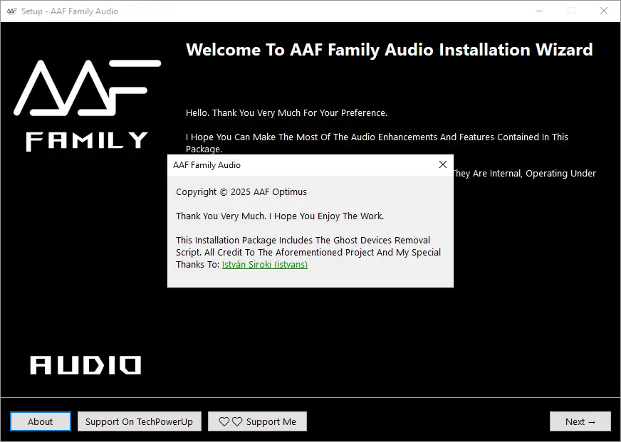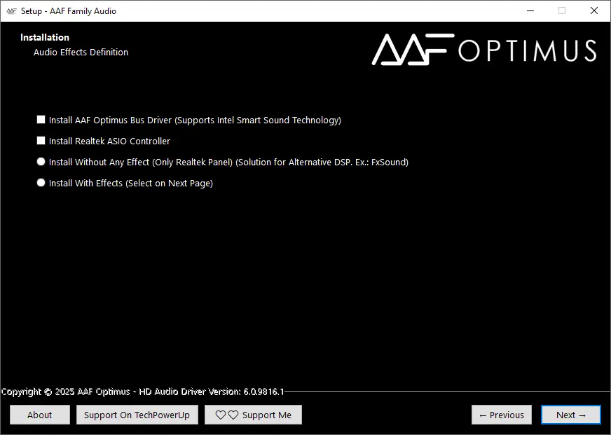 AAF Family DCH Audio Realtek — модифицированный аудиодрайвер для материнских плат с чипами Realtek, объединяющий в себе широкий спектр технологий обработки звука, включая Dolby, DTS, Nahimic, Sonic Studio и другие. Решение подходит для пользователей, стремящихся к максимальному качеству воспроизведения аудио в музыке, кино и играх, с возможностью гибкой настройки и выбора компонентов установки.
