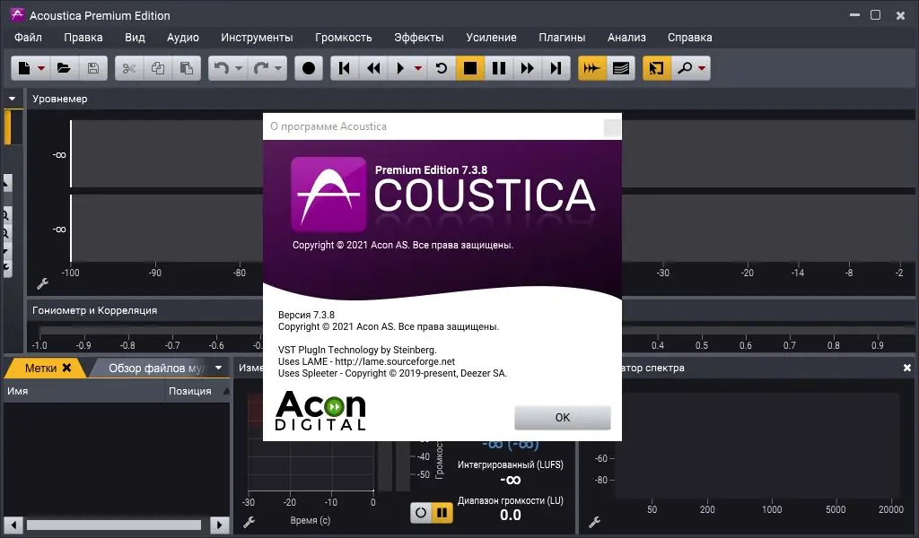 Acoustica Premium Edition разработана компанией Acon Digital Media и позиционируется как универсальное решение для аудиопроизводства. Программа ориентирована на музыкантов, звукорежиссёров, подкастеров и всех, кто работает с цифровым звуком. Она объединяет в себе функции многотрековой записи, тонкого редактирования, анализа аудиосигнала и финального мастеринга. Архитектура приложения позволяет интегрировать сторонние плагины, а встроенные инструменты охватывают широкий спектр задач — от базовых операций до сложной реставрации старых записей.