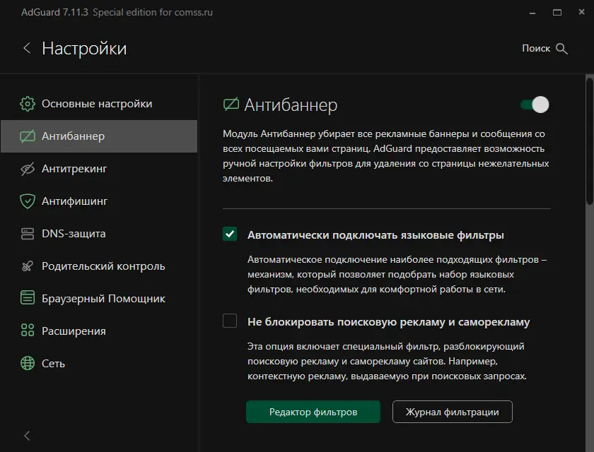 Adguard использует передовые технологии фильтрации, включая анализ трафика в реальном времени и интеграцию с внешними базами угроз