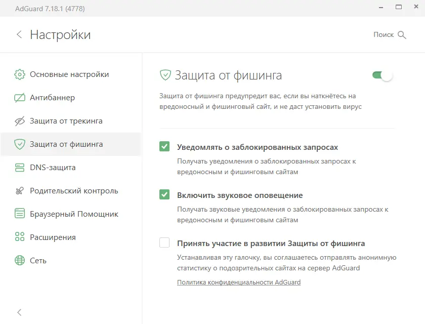 После установки программа запускается автоматически и начинает работу без необходимости дополнительной настройки. Интерфейс интуитивно понятен: основные функции доступны через центральное меню, где можно активировать антифишинг, антитрекинг или родительский контроль. Для тонкой настройки доступен помощник ручного управления, позволяющий создавать пользовательские фильтры. Расширение для браузера даёт возможность блокировать отдельные элементы на странице с помощью точечного выбора. Журнал активности отображает все заблокированные запросы, что помогает контролировать эффективность защиты.