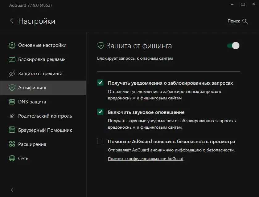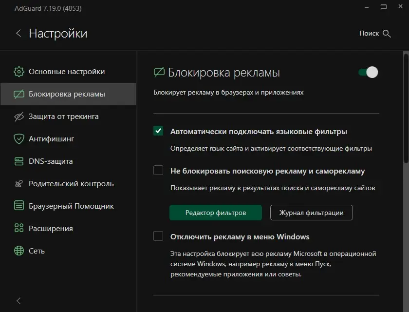 Adguard — это многофункциональный интернет-фильтр, обеспечивающий защиту от вредоносных сайтов, фишинга и назойливой рекламы. Программа эффективно блокирует трекеры, ускоряет загрузку страниц и включает родительский контроль. Решение подходит для пользователей, стремящихся повысить безопасность и комфорт в сети.