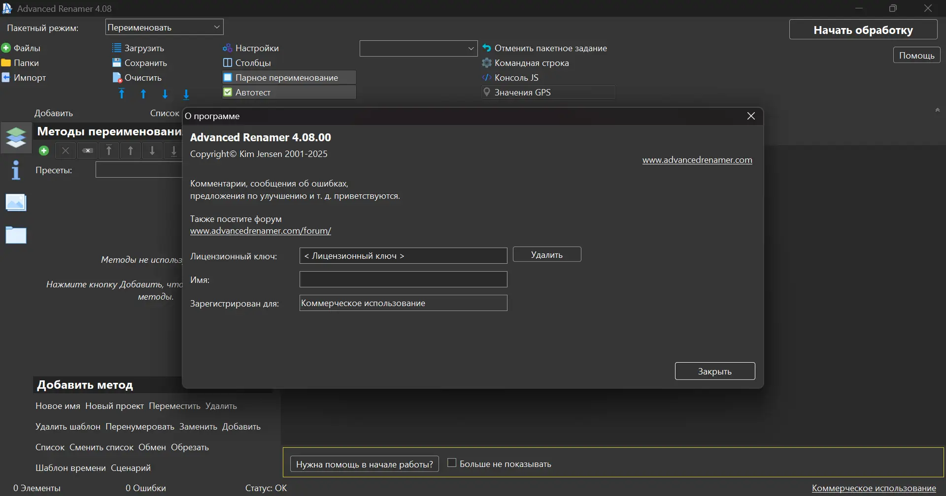 Advanced Renamer — мощное приложение для массового переименования файлов и папок в системе Windows, сочетающее в себе гибкость, точность и поддержку множества форматов. Утилита позволяет автоматизировать процесс организации файлов, используя разнообразные методы именования на основе метаданных, шаблонов и системных атрибутов. Программа поддерживает работу с мультимедийными файлами, изображениями и документами, обеспечивая точное и быстрое переименование без потери данных.