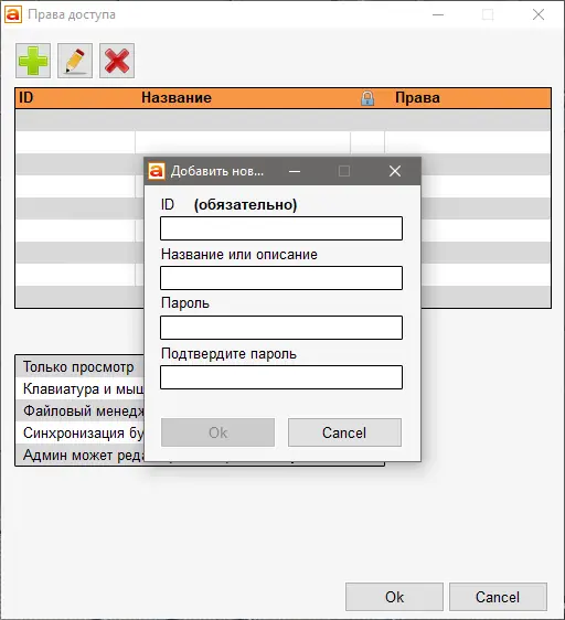 - Возможность настройки прав доступа: просмотр экрана, управление, синхронизация буфера обмена