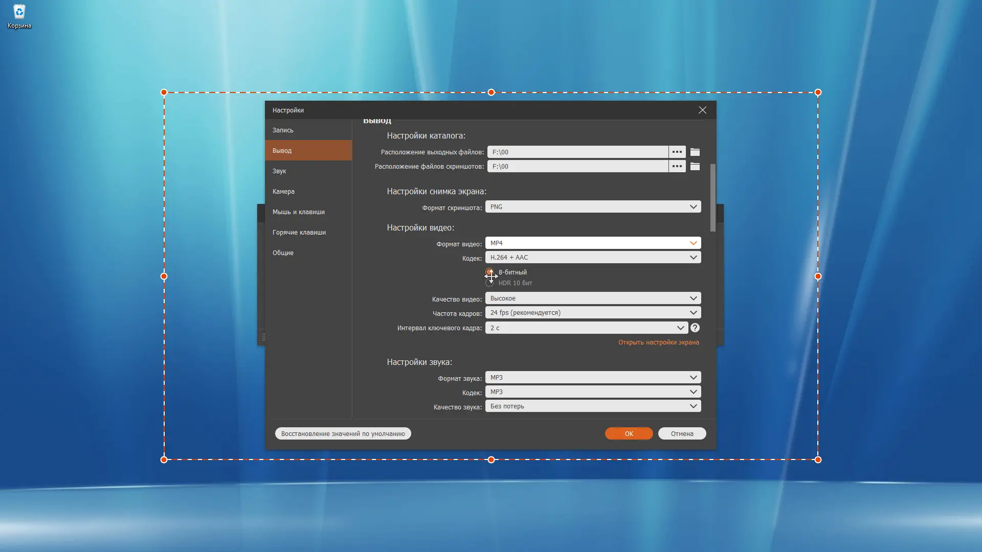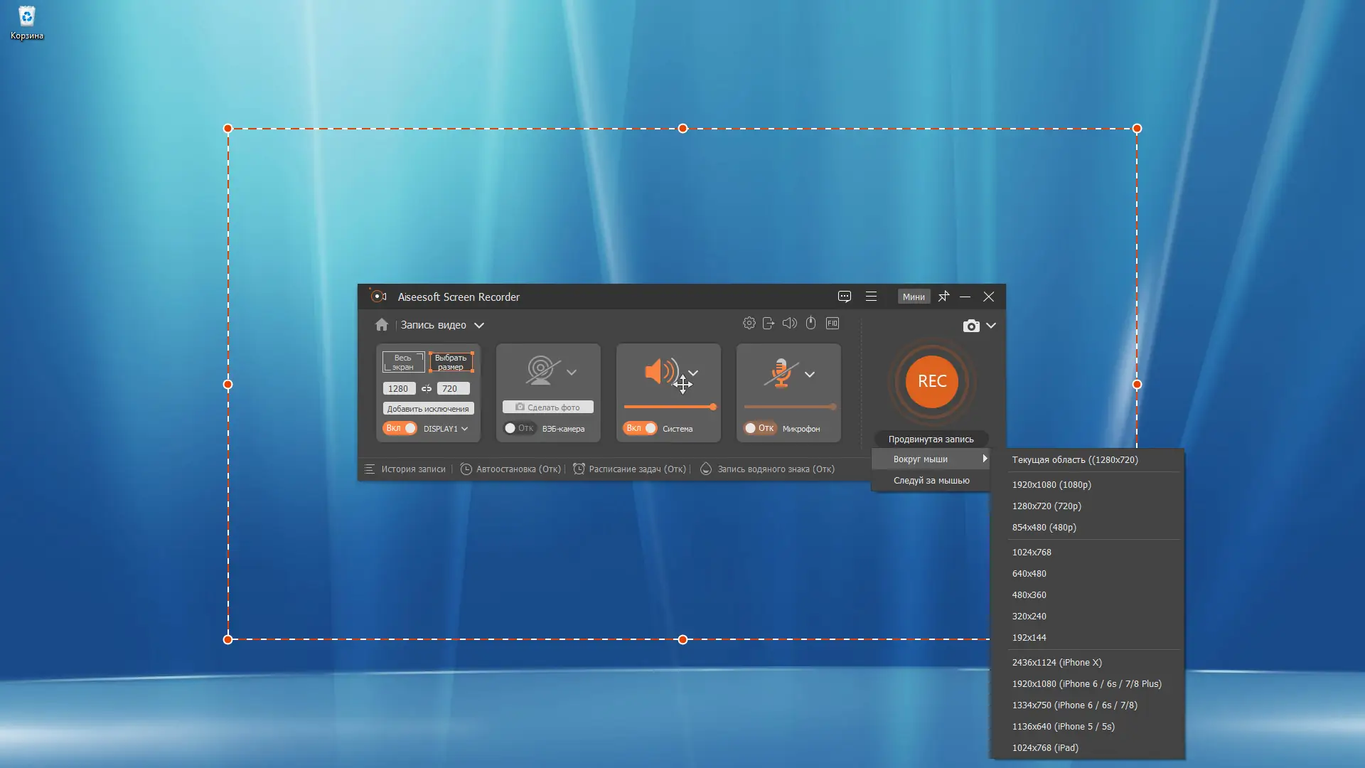 - Запись экрана в различных режимах: полноэкранный, оконный, пользовательский