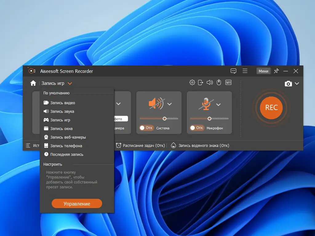 Aiseesoft Screen Recorder — это многофункциональный инструмент для захвата экрана и записи видео с высоким качеством. Программа поддерживает запись игрового процесса, видеозвонков, вебинаров и других действий на экране компьютера. Она сочетает в себе простоту использования и профессиональные функции редактирования в реальном времени.