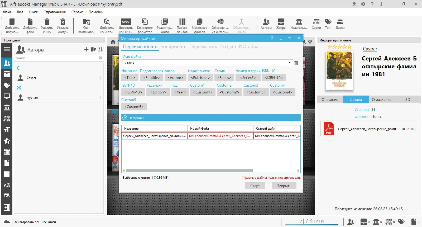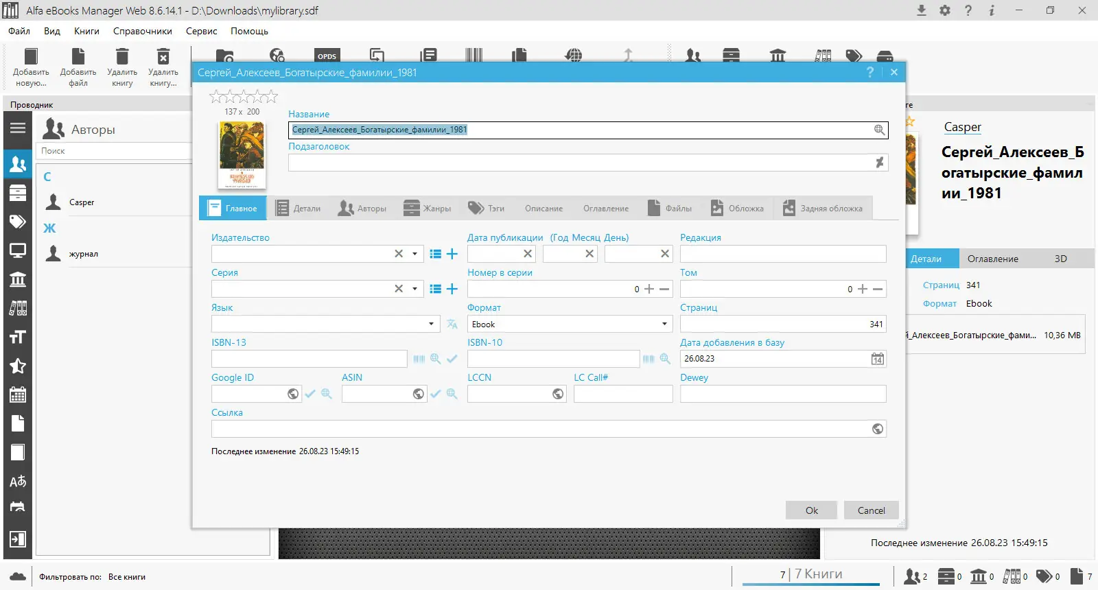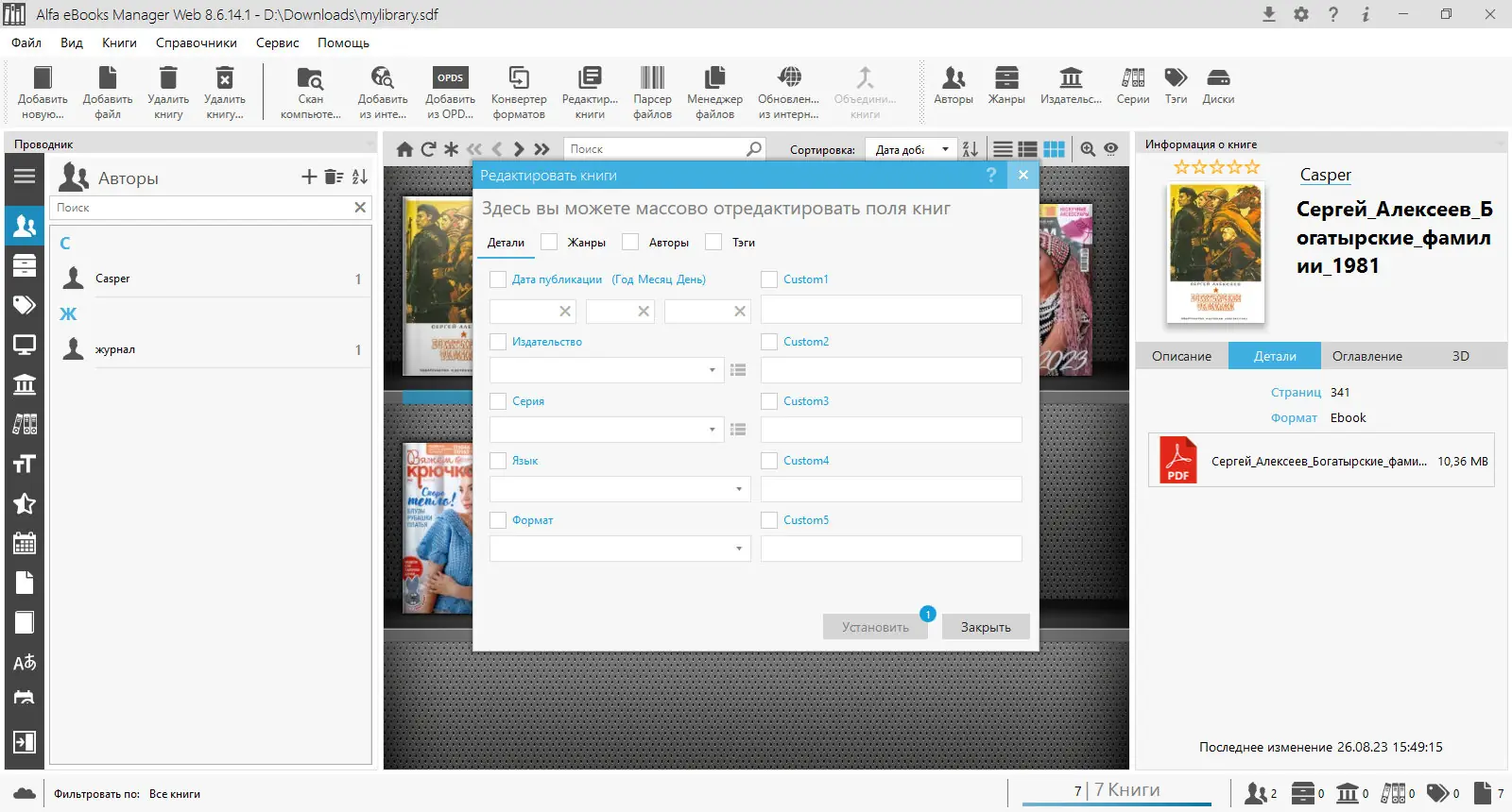 Alfa eBooks Manager предлагает комплексный подход к организации личной библиотеки, объединяя функции каталогизатора, читалки, конвертера и медиаплеера. Программа автоматически сканирует жёсткий диск, находя файлы книг и аудиозаписей, извлекает обложки, авторов, аннотации и прочие данные. Каждой книге можно назначить несколько тегов, жанров, авторов с указанием их роли, а также прикрепить дополнительные файлы, например, рецензии или сканы страниц. Поддержка пользовательских полей позволяет адаптировать структуру под индивидуальные нужды. Версия pro предоставляет расширенные инструменты, включая групповое редактирование и конвертер форматов.