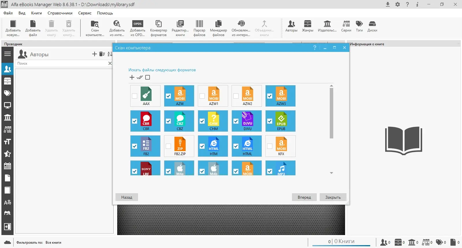 - Автоматическое сканирование компьютера на наличие книг и их добавление в базу