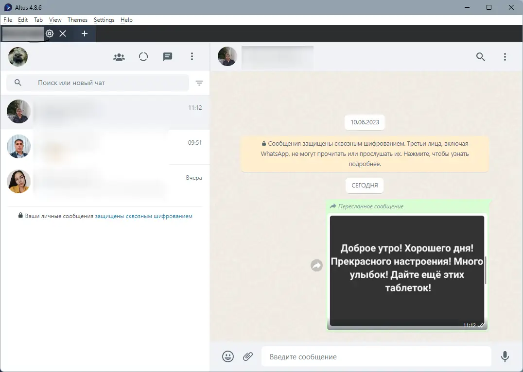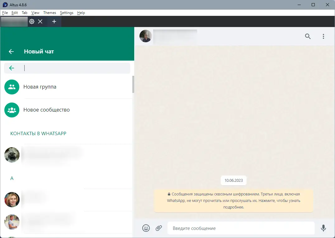 Altus представляет собой альтернативный клиент WhatsApp, разработанный с использованием Electron, что обеспечивает кроссплатформенную совместимость и стабильность работы. Приложение не требует установки мобильного приложения для синхронизации, так как работает напрямую с веб-версией сервиса, но при этом предлагает дополнительные возможности, недоступные в официальном клиенте. Интерфейс остаётся привычным, но дополнен полезными улучшениями, направленными на повышение удобства использования. Разработчики сосредоточились на гибкости и персонализации, что особенно оценят пользователи, активно управляющие несколькими чатами и учётными записями.