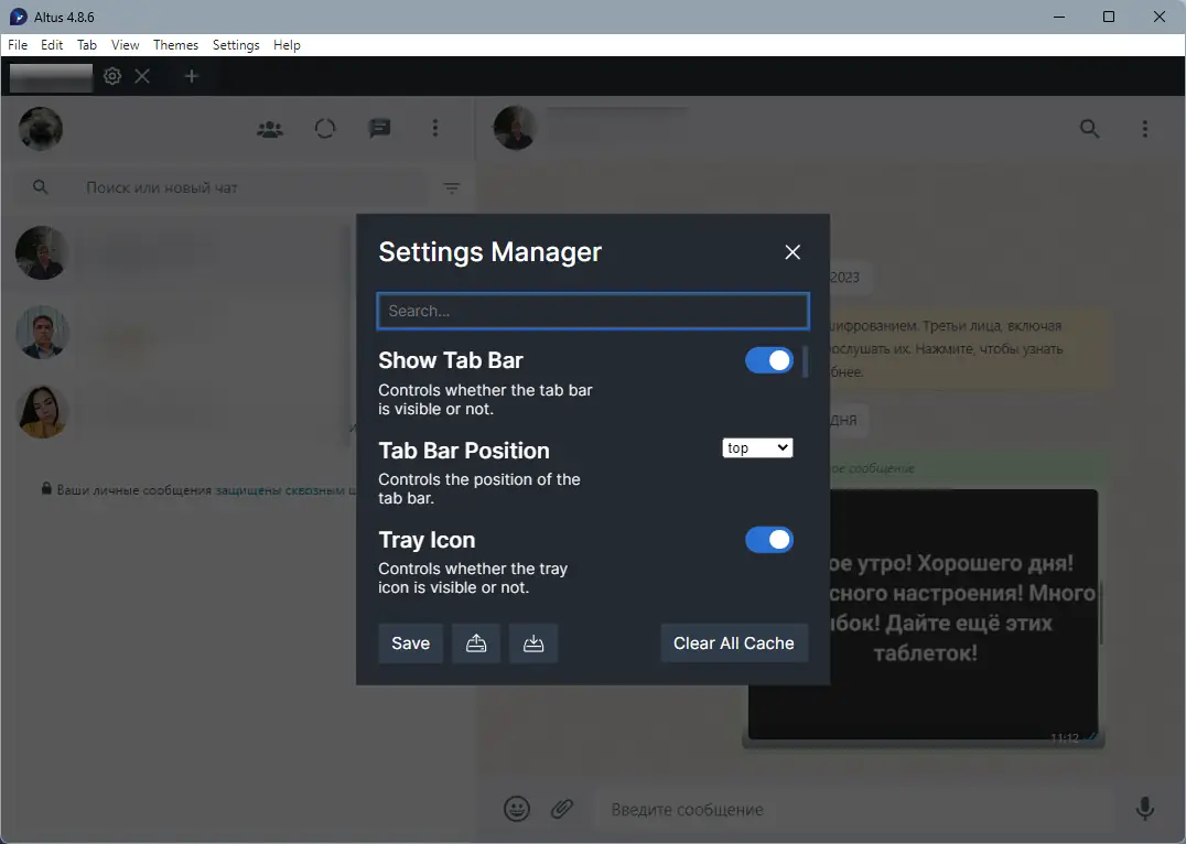 Использование Altus не требует специальных навыков и интуитивно понятно даже новичкам. После запуска приложение открывает окно для сканирования QR-кода с основного устройства, как и в официальной веб-версии. После подключения можно добавить дополнительные учётные записи через меню управления профилями. Уведомления активируются автоматически, а при получении нового сообщения появляется всплывающее окно. Через настройки доступна активация темного режима или загрузка собственной темы в формате CSS. Пользователи могут сохранять свои настройки в папке AltusData, что особенно полезно при обновлении или переустановке. Значок в системном трее позволяет сворачивать приложение без потери функциональности — все уведомления продолжают приходить в штатном режиме.