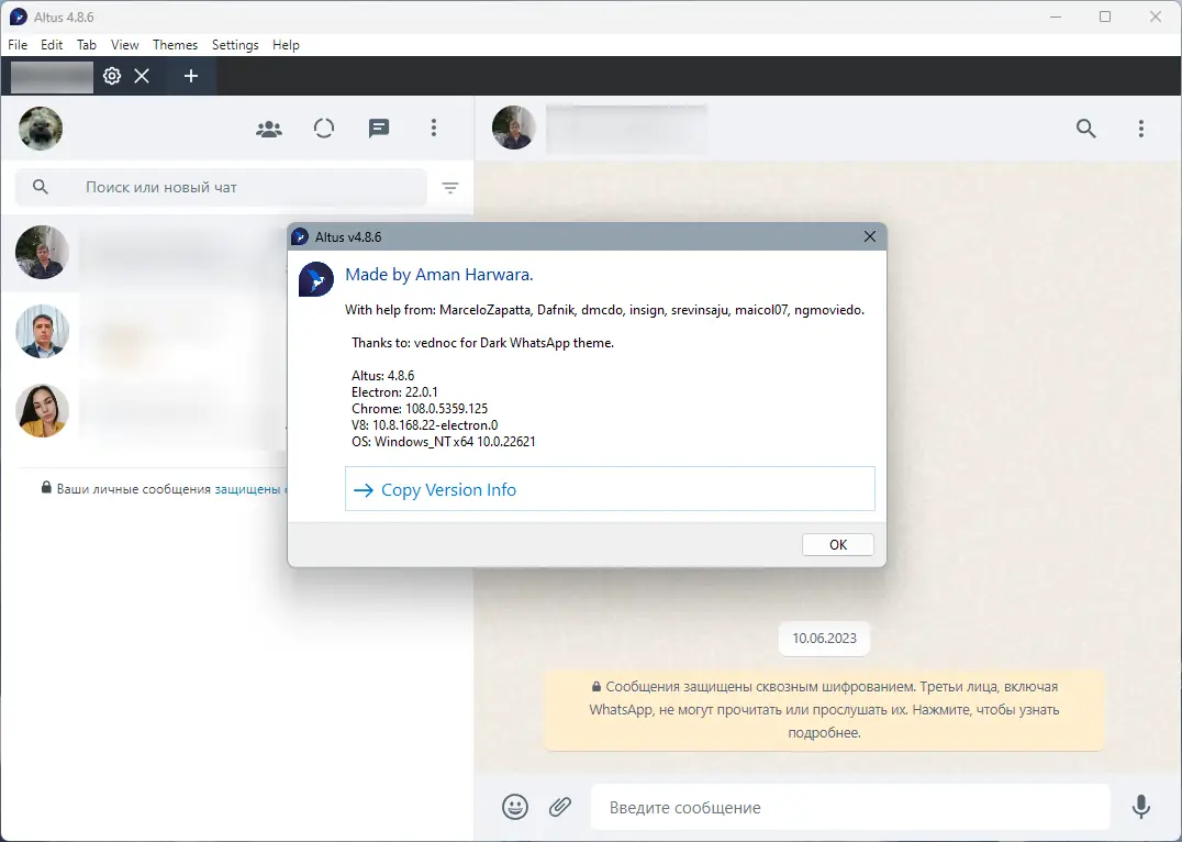 Altus — это неофициальный десктопный клиент для WhatsApp, построенный на платформе Electron. Программа предлагает расширенные функции, включая поддержку нескольких аккаунтов, темный режим и настройку внешнего вида через пользовательские темы. Удобный интерфейс и работа с уведомлениями делают общение более гибким и комфортным на персональном компьютере.