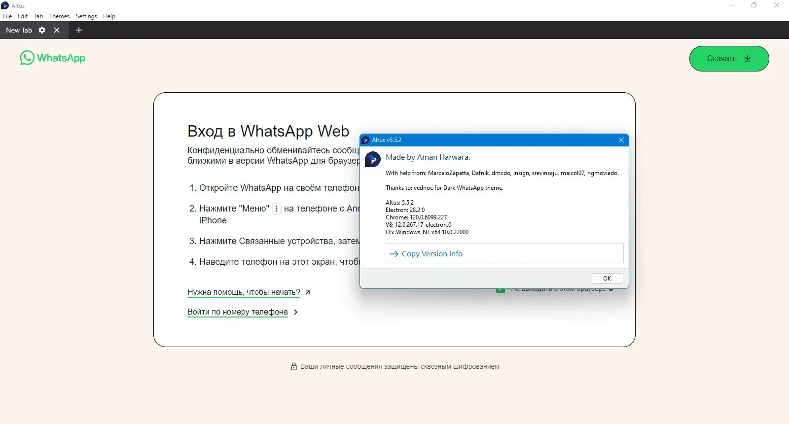 Altus — это неофициальный десктопный клиент для WhatsApp, созданный на платформе Electron. Программа предоставляет расширенные функции, включая поддержку нескольких аккаунтов, тем оформления и удобных уведомлений.