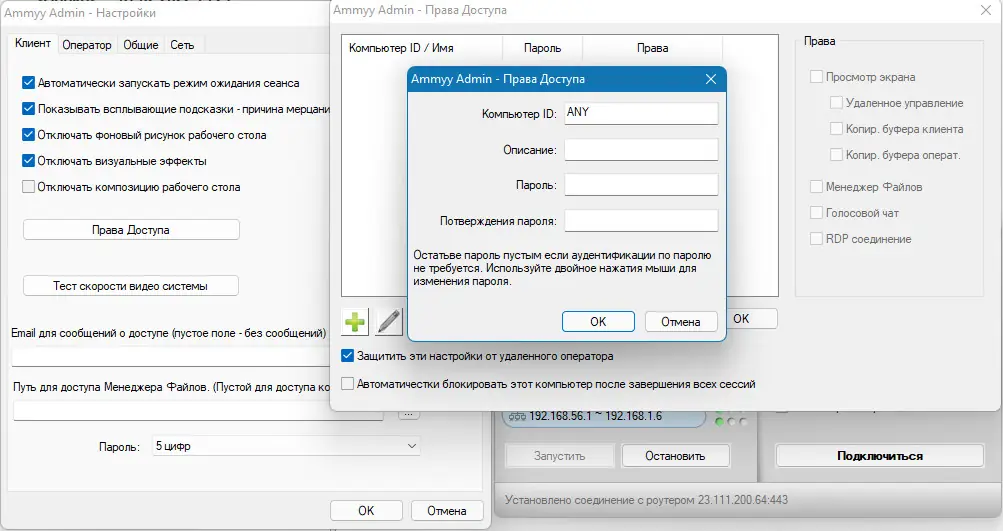 - Возможность подключения по ID, паролю или IP-адресу