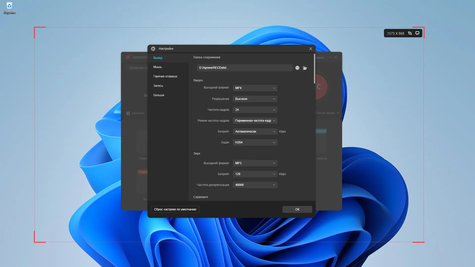 Поддержка нескольких источников звука позволяет гибко настраивать запись — можно включить системный аудио, микрофон или оба одновременно.