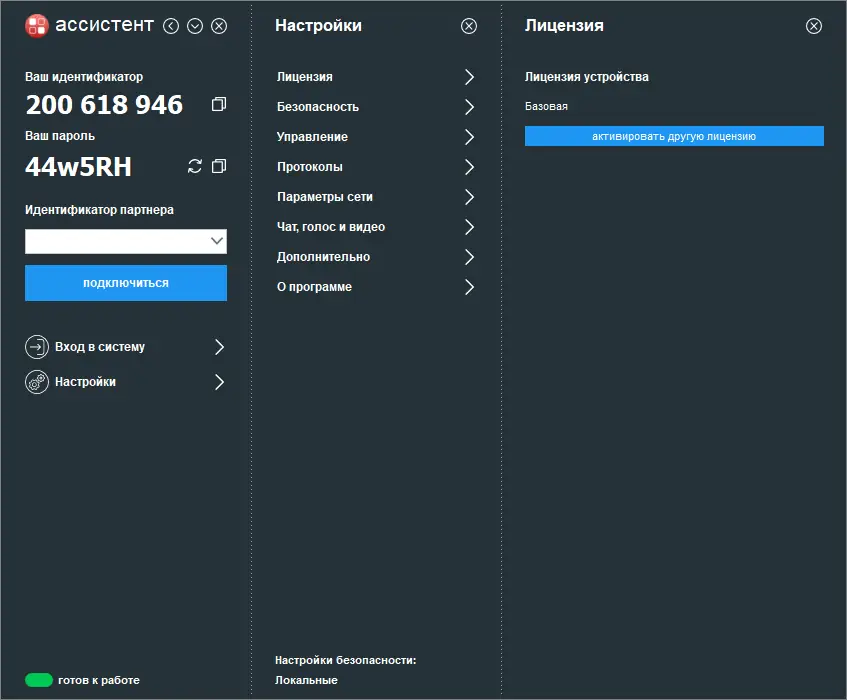 Использование АССИСТЕНТ начинается с установки клиента на устройство, к которому необходим доступ. После запуска приложение работает в фоне, обеспечивая защиту и готовность к подключению. Подключение осуществляется через идентификатор и пароль, которые можно использовать как в постоянных, так и в сессионных режимах. Пользователь может подключаться к нескольким компьютерам одновременно, организовывать групповые сессии, передавать файлы, выполнять команды через консоль и управлять устройствами ввода. Работа с мультимониторными системами поддерживается полностью, включая переключение между экранами и настройку отображения. Для быстрого подключения без установки используется портативная версия «Быстрый старт», запускаемая в один клик.