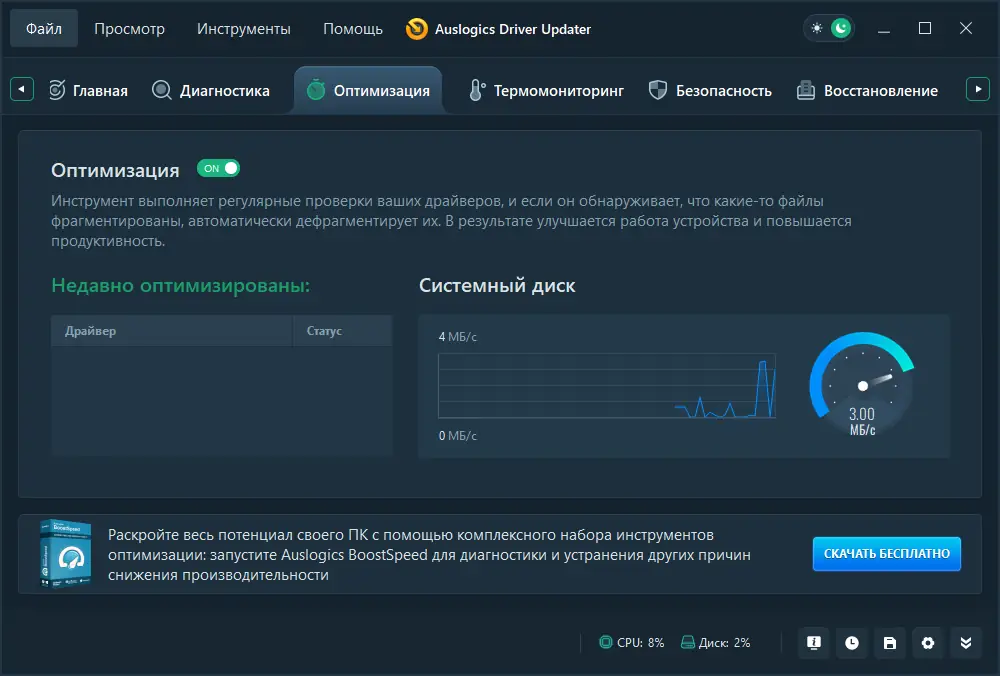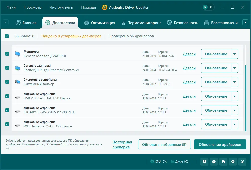Auslogics Driver Updater — это инструмент для автоматического поиска и установки актуальных версий драйверов на компьютерах под управлением Windows. Программа быстро сканирует систему, определяет устаревшие компоненты и предлагает обновить их в один клик, обеспечивая стабильную работу оборудования. Процесс сопровождается резервным копированием, что исключает риски при сбоях после обновления.