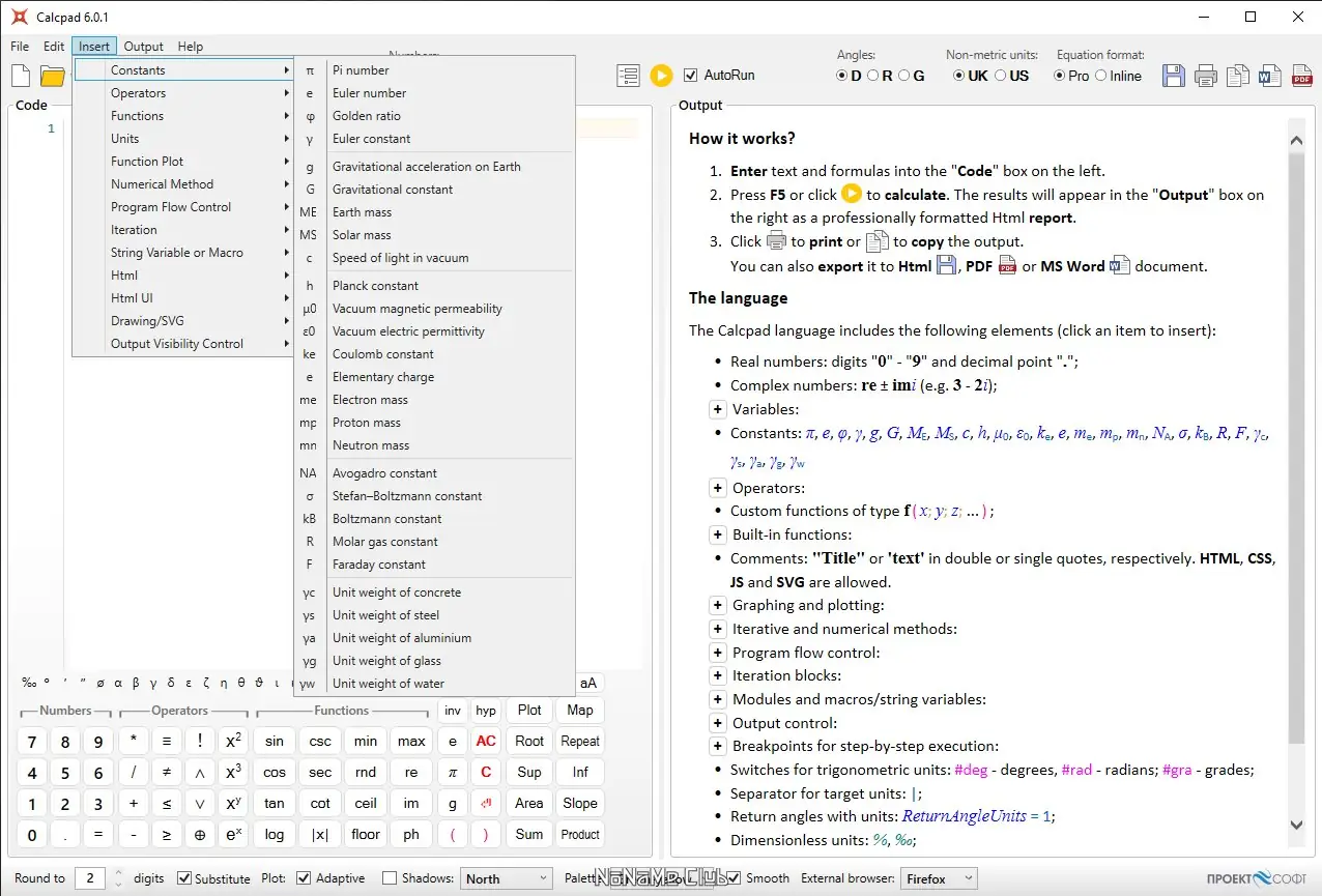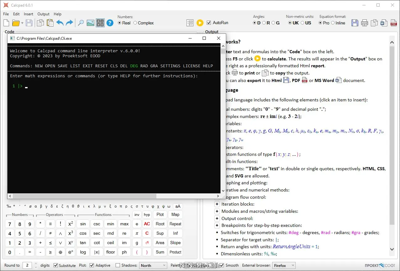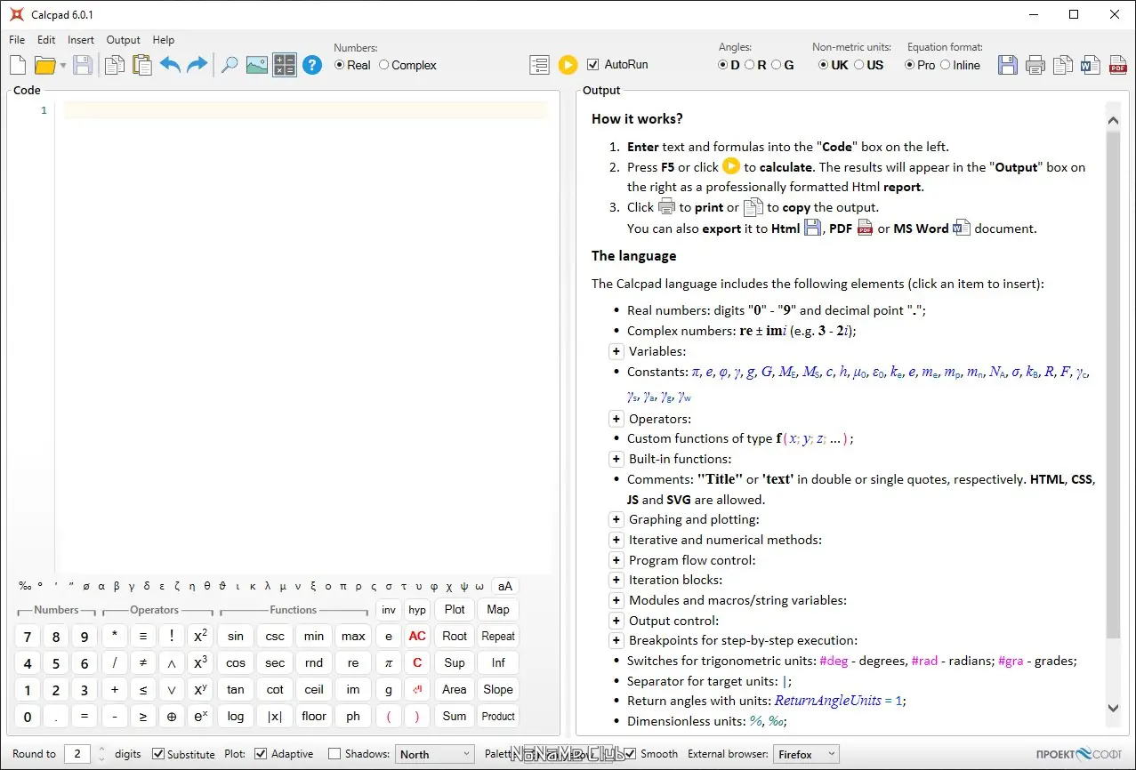 Calcpad — это бесплатное программное обеспечение, предназначенное для выполнения математических и инженерных расчетов. Программа сочетает в себе функциональность программируемого калькулятора с возможностью генерации отчётов в формате HTML. Она поддерживает работу с комплексными числами, единицами измерения, пользовательскими функциями и численными методами. Результаты расчётов оформляются в виде структурированных отчётов, пригодных для печати и дальнейшего использования.