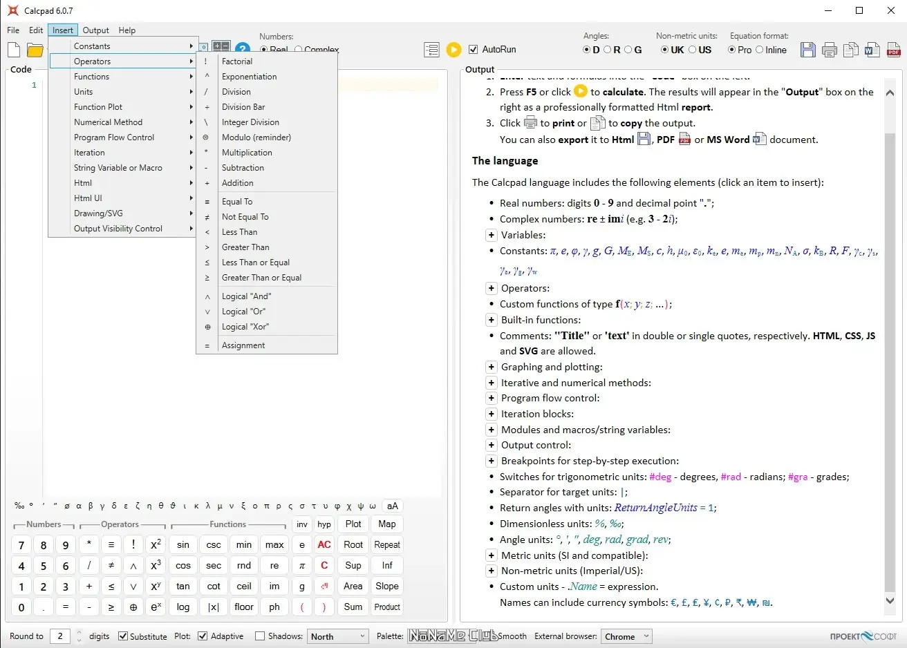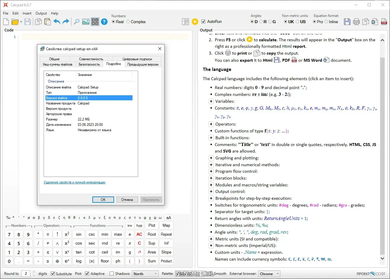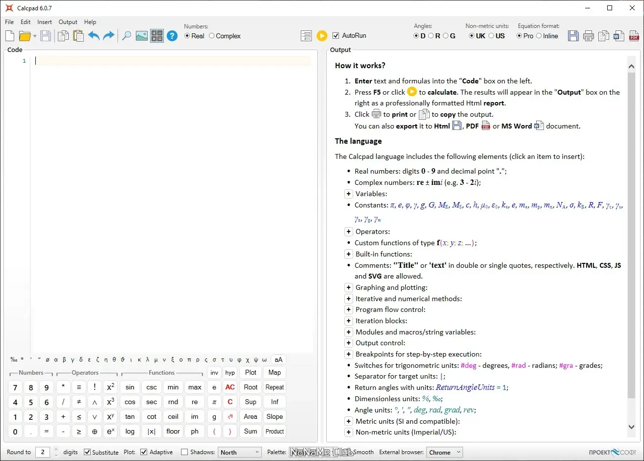 Calcpad — это современное программное обеспечение для выполнения математических и инженерных расчетов, сочетающее функциональность программируемого калькулятора с возможностью автоматической генерации отчетов в формате HTML. Приложение поддерживает работу с комплексными числами, единицами измерения, пользовательскими функциями и численными методами, обеспечивая высокую точность и наглядность результатов.