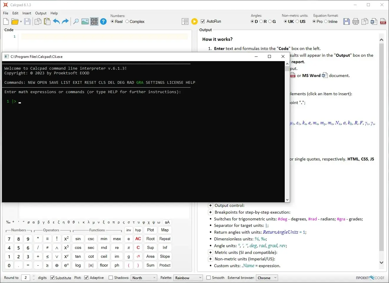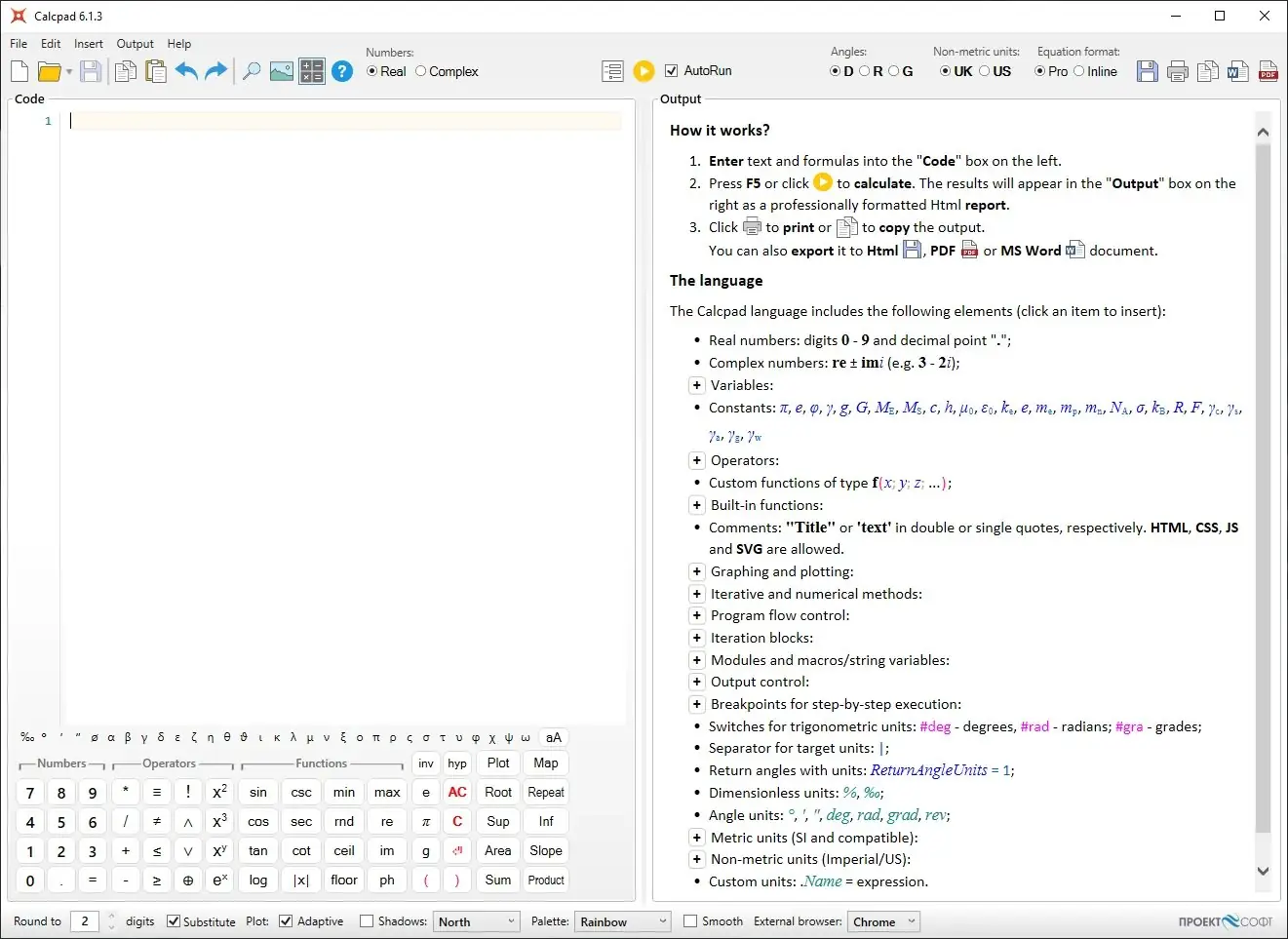 Использование Calcpad начинается с ввода математических выражений в редакторе. Пользователь может объявлять переменные, задавать функции, использовать условные операторы и циклы для построения сложных алгоритмов. Программа поддерживает текстовые комментарии, оформленные в кавычках, а также включение HTML и CSS для улучшения внешнего вида отчетов. После выполнения вычислений результаты отображаются в виде структурированного HTML-документа с возможностью экспорта в PDF и Word. Автоматическая подстановка значений и умное округление чисел повышают точность и читаемость выходных данных. Также доступна генерация интерактивных форм для ввода параметров, что удобно при многократном использовании одного и того же шаблона расчета.