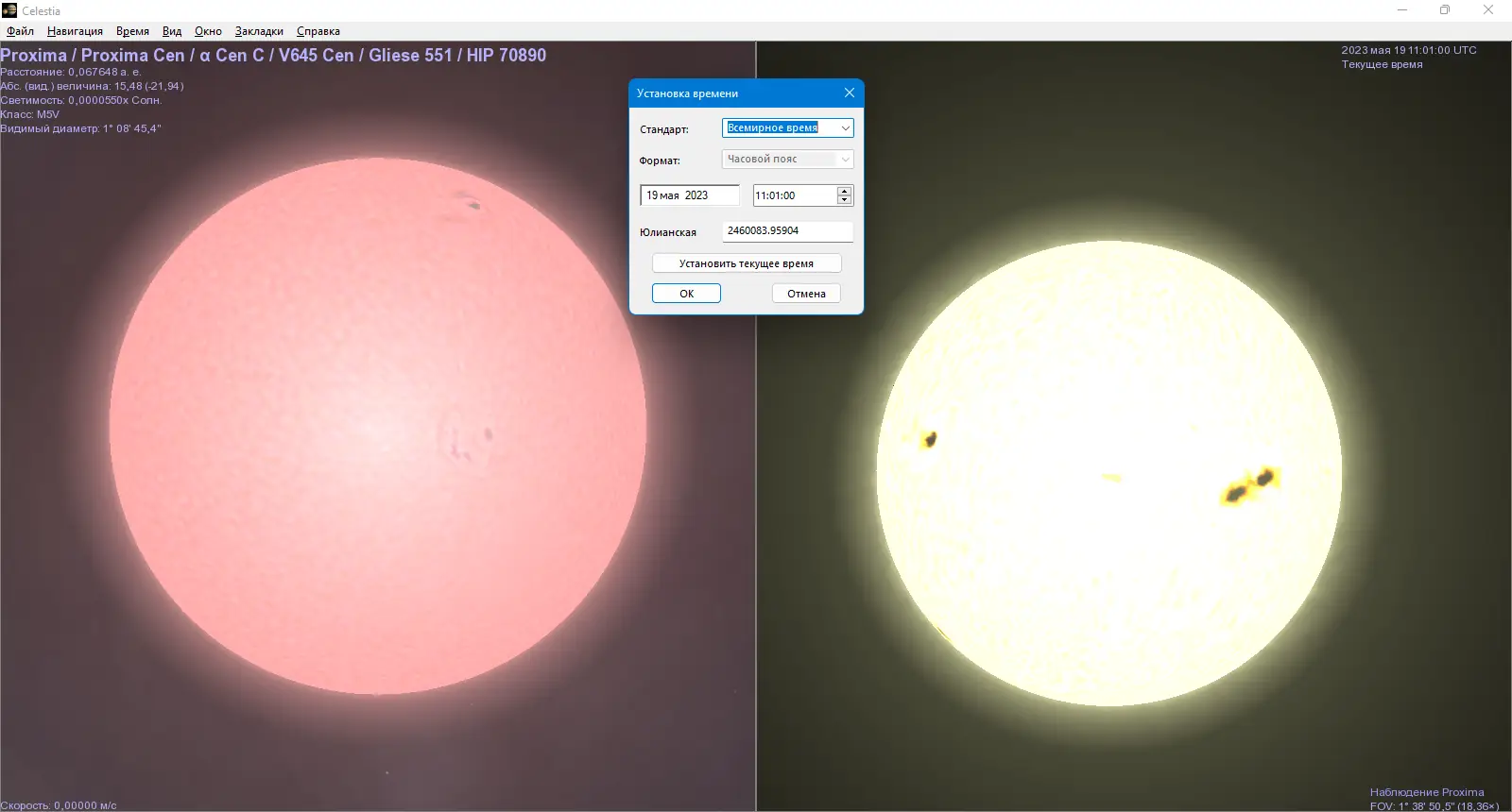 Использование Celestia интуитивно понятно благодаря продуманному интерфейсу и гибким настройкам. Управление осуществляется с помощью клавиатуры и мыши: можно приближать и отдалять объекты, вращать камеру, перемещаться между небесными телами и изменять скорость времени. Программа позволяет отслеживать орбиты планет, экзопланет, астероидов, комет и космических аппаратов, а также включать подписи для всех объектов — от звезд до городов на поверхности планет. Дополнительно доступна настройка угла обзора от широкого поля до экстремального приближения, что полезно при изучении мелких деталей. Пользователи могут делить окно на несколько панелей для одновременного наблюдения за разными объектами, а также включать коррекцию положения звезд с учетом скорости света. Подключение дополнительных модулей расширяет функционал, добавляя новые объекты, текстуры и сценарии.