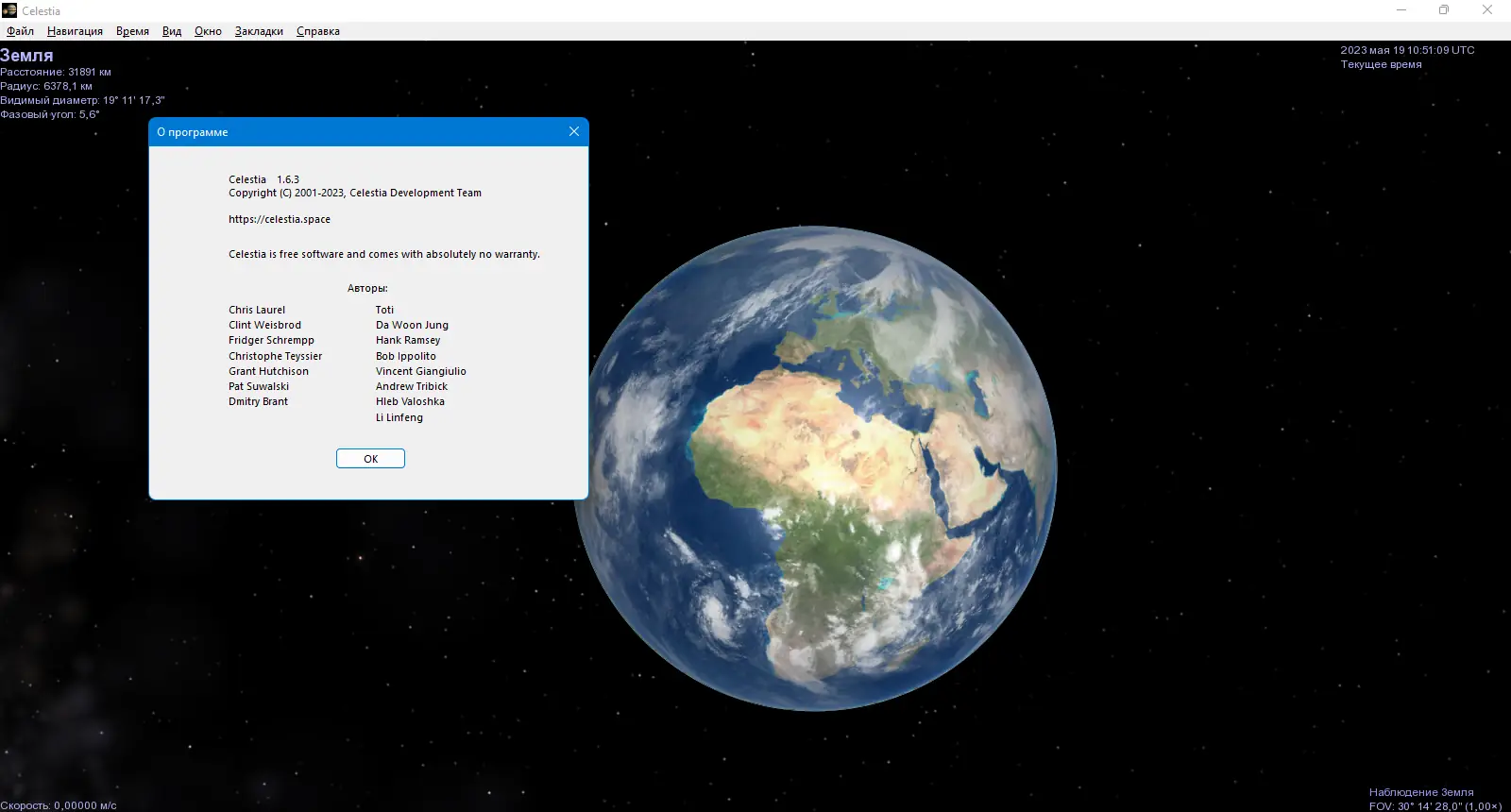 Celestia — это бесплатная 3D-программа для изучения космоса, позволяющая исследовать Вселенную от искусственных спутников до далеких галактик. Пользователь может свободно перемещаться в пространстве и времени, наблюдать за движением небесных тел и изучать астрономические явления с высокой точностью и реалистичной графикой.