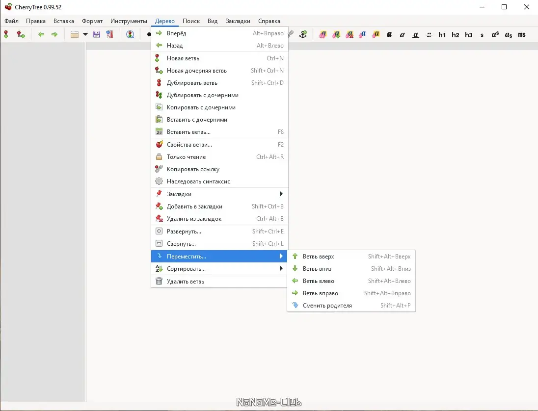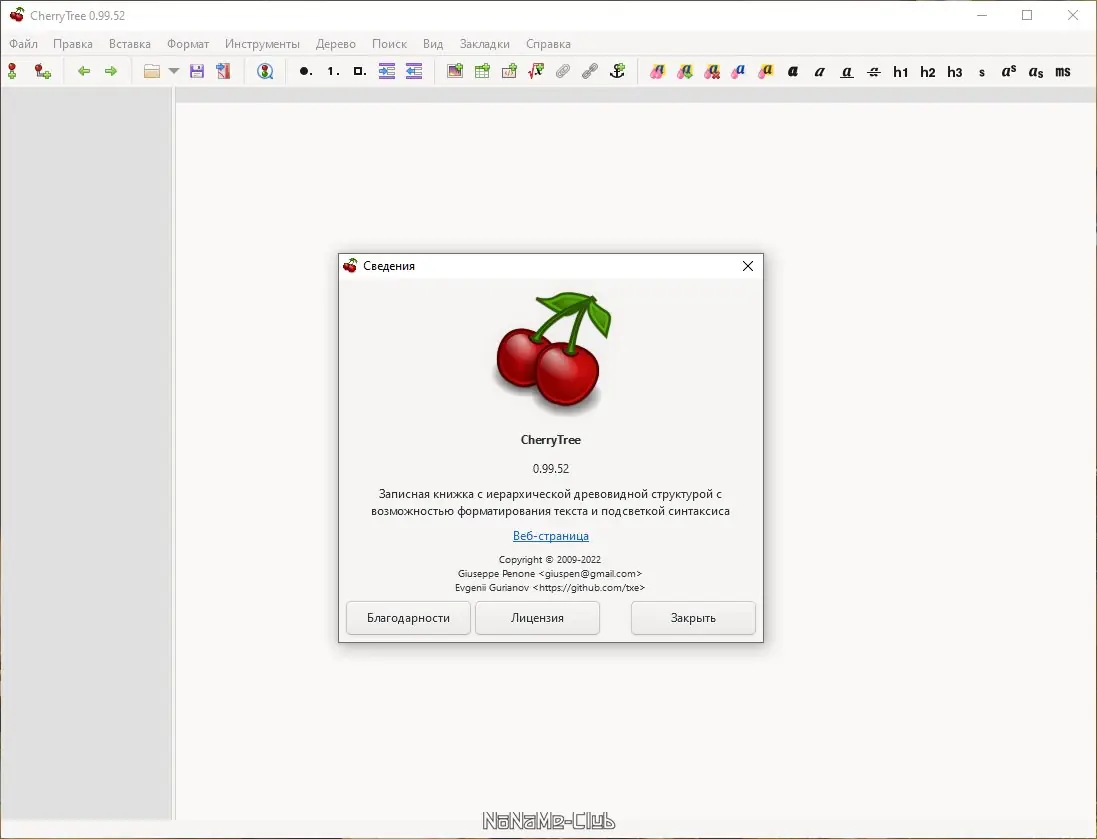 CherryTree — это многофункциональная программа для создания и управления заметками с поддержкой иерархической структуры, подсветки синтаксиса и защиты данных паролем. Приложение подходит как для личного, так и для профессионального использования, позволяя удобно организовывать информацию, импортировать и экспортировать записи, вставлять мультимедийные элементы и работать с текстом в режиме WYSIWYG. Интерфейс интуитивно понятен, а русский язык подключается автоматически после первого запуска.