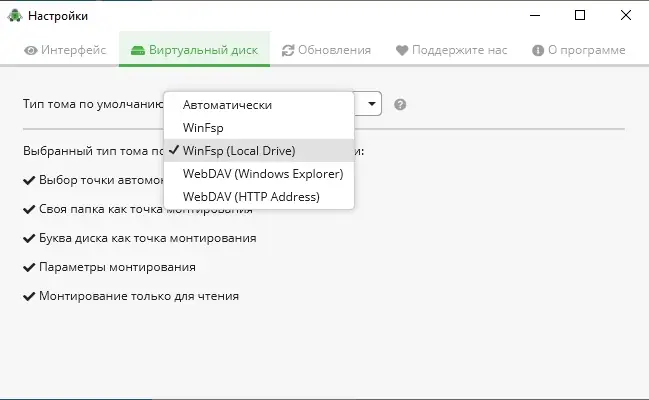 - Интеграция с системой через виртуальный диск, что упрощает работу с файлами.