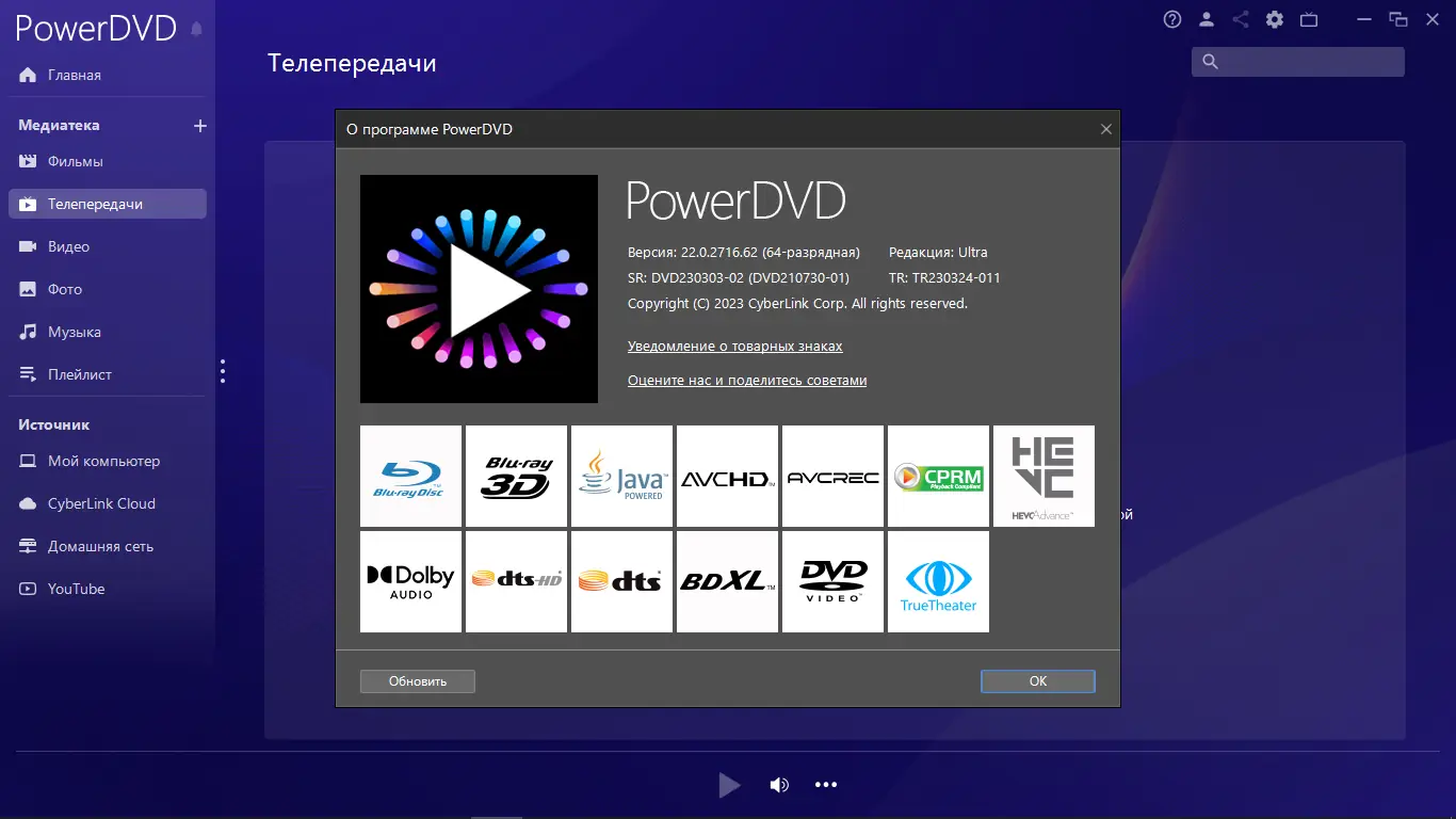 CyberLink PowerDVD — это универсальный медиапроигрыватель, предназначенный для высококачественного воспроизведения видео и аудио на компьютере. Программа поддерживает широкий спектр форматов, включая DVD, Video-CD, MKV, FLV, WTV и другие, обеспечивая стабильную работу и продвинутые функции обработки изображения и звука. Благодаря технологиям TrueTheater, пользователь получает улучшенную чёткость, насыщенные цвета и объёмное звучание. Интерфейс приложения интуитивно понятен, поддерживает смену тем и легко настраивается под предпочтения. Дополнительные возможности включают захват кадров, создание медиатеки, синхронизацию с мобильными устройствами и интеграцию с онлайн-сервисами.