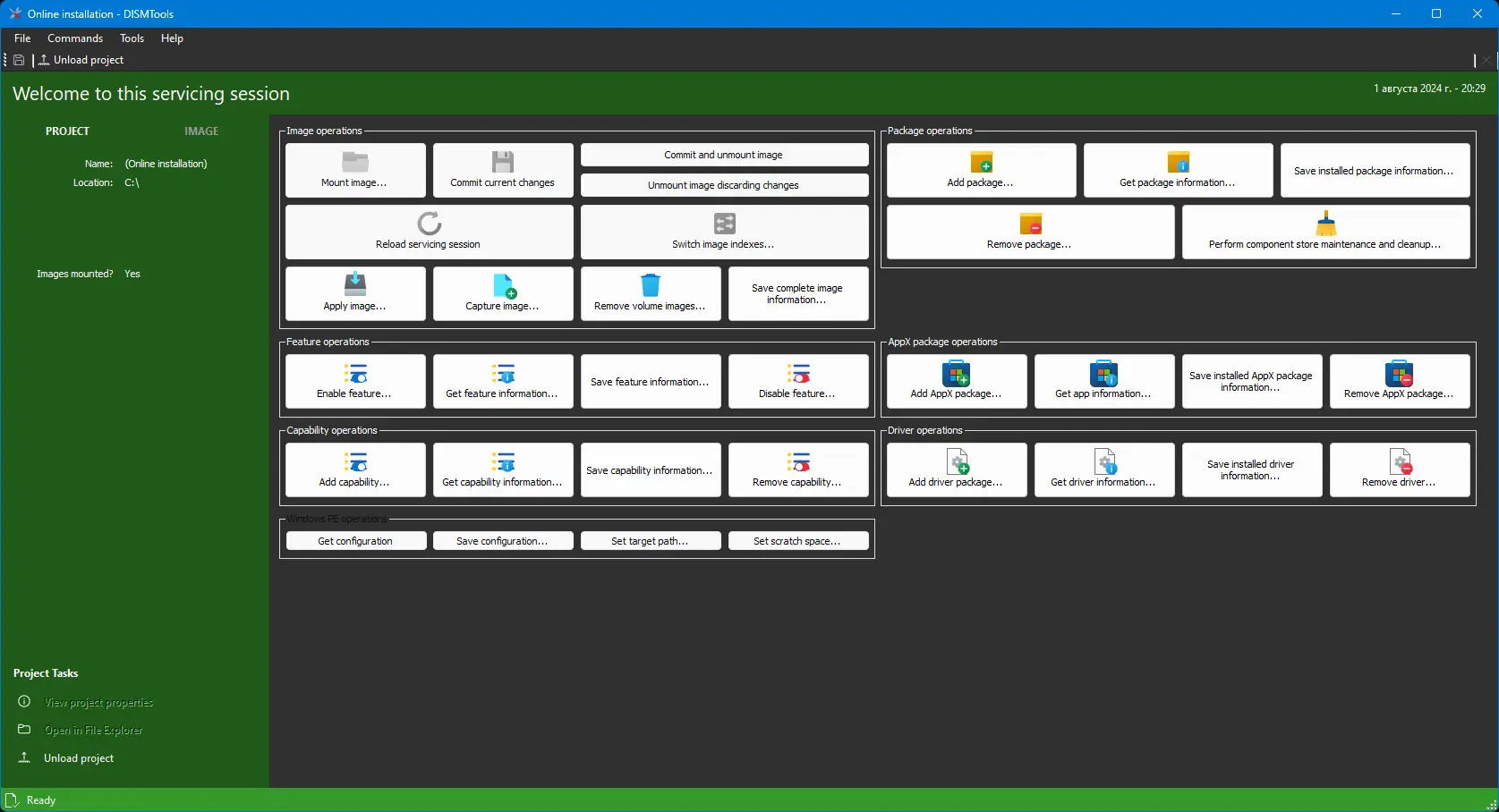 DISMTools представляет собой бесплатное и с открытым исходным кодом приложение, разработанное как альтернатива существующим оболочкам для DISM. Оно объединяет в себе функциональность управления образами, установками и компонентами операционной системы через интуитивно понятный графический интерфейс. Программа поддерживает как офлайн, так и онлайн режимы работы, что позволяет редактировать как смонтированные образы, так и активные системы на любом диске. Архитектура приложения основана на проектах, что облегчает организацию и перенос рабочих данных между устройствами.