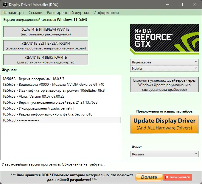 - Полное и бесследное удаление всех компонентов драйверов, включая остатки в реестре.