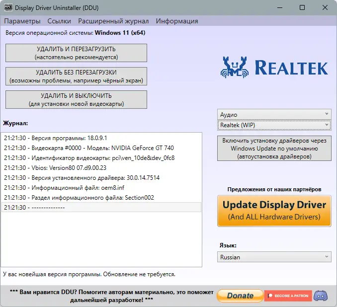 Display Driver Uninstaller — это специализированная утилита для полного удаления драйверов видеокарт и аудиоустройств из операционной системы Windows. Программа эффективно удаляет остаточные файлы, записи реестра и папки, оставленные после деинсталляции драйверов AMD, NVIDIA, Intel, а также аудиодрайверов Realtek и Sound Blaster. Инструмент особенно полезен при возникновении конфликтов или сбоях в работе графической подсистемы.