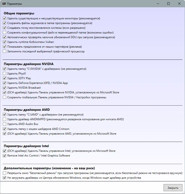 - Полное удаление всех файлов, папок и ключей реестра, связанных с драйверами AMD и NVIDIA.