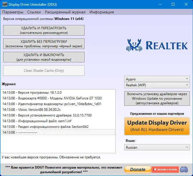 - Позволяет очистить как текущие, так и ранее установленные версии драйверов, предотвращая конфликты совместимости.