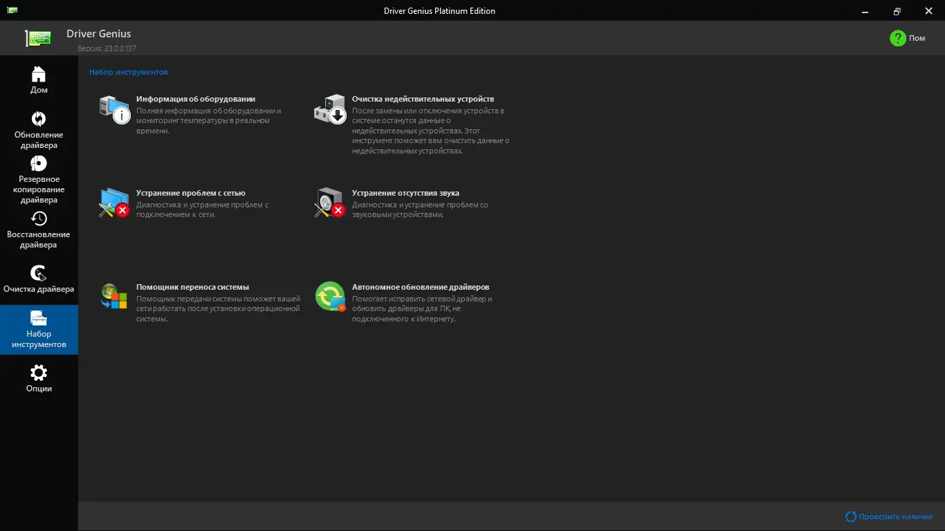 Driver Genius представляет собой программное обеспечение, ориентированное на обслуживание драйверов всех подключённых устройств. Она автоматически сканирует систему, определяет устаревшие, повреждённые или отсутствующие драйверы и предлагает актуальные версии из собственной обновляемой базы. Инструмент включает в себя как базовые функции управления драйверами, так и дополнительные утилиты для диагностики и оптимизации системы. Работа с приложением не требует глубоких технических знаний, что делает его доступным для широкого круга пользователей.
